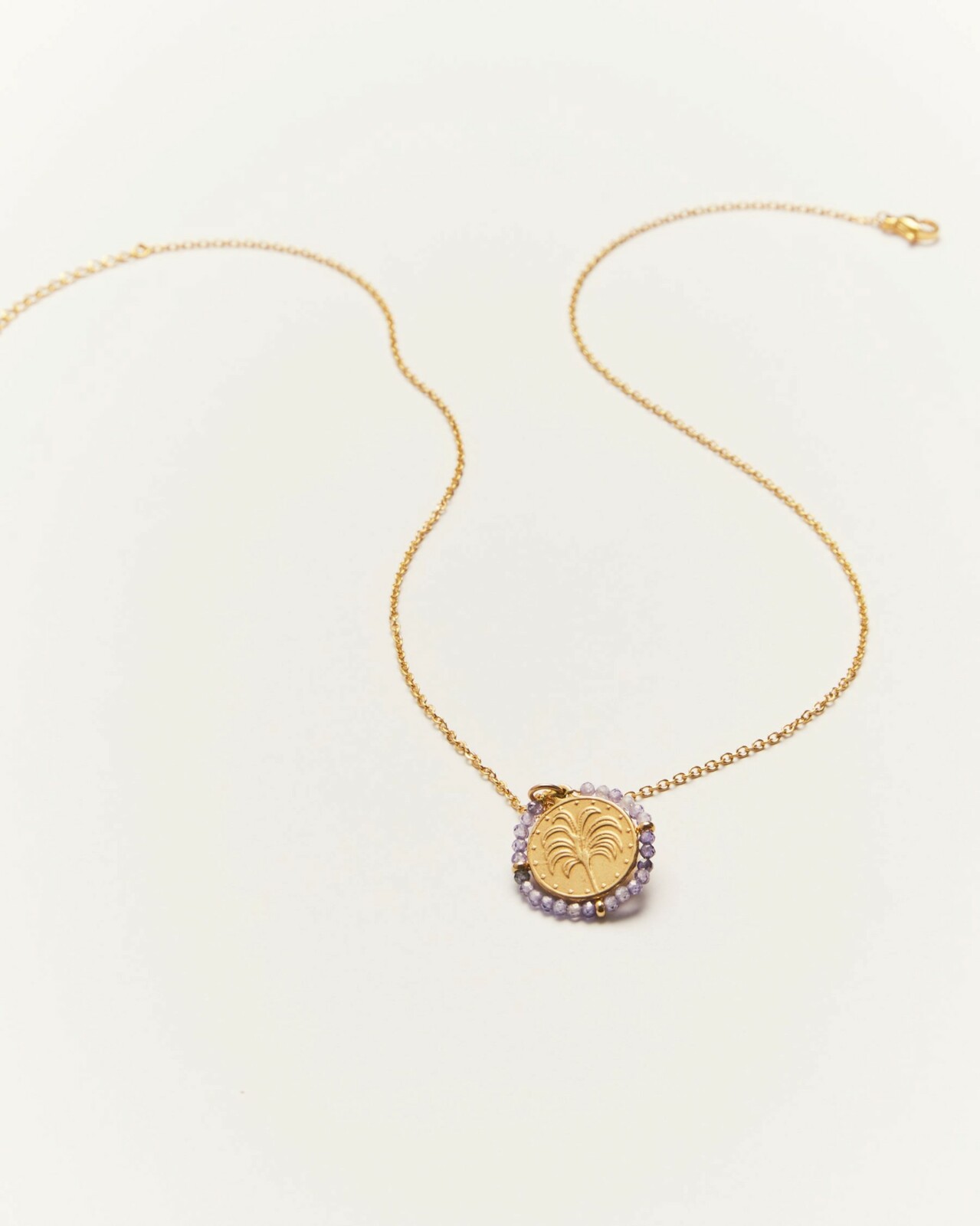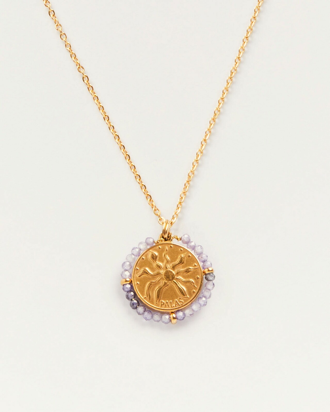 Cadwyn medaliwn gyda haul ar un ochr a phalmwydd ar yr ochr arall.