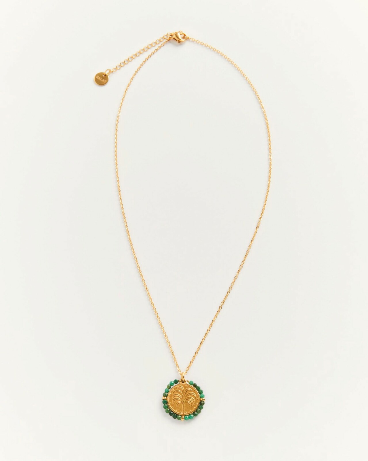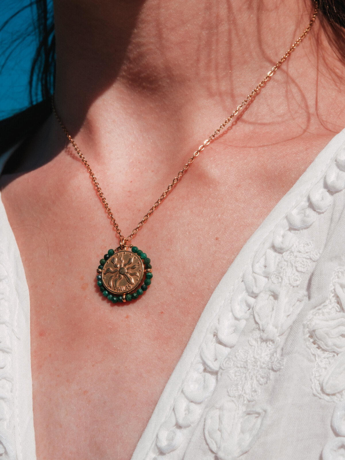Cadwyn medaliwn gyda haul ar un ochr a phalmwydd ar yr ochr arall.