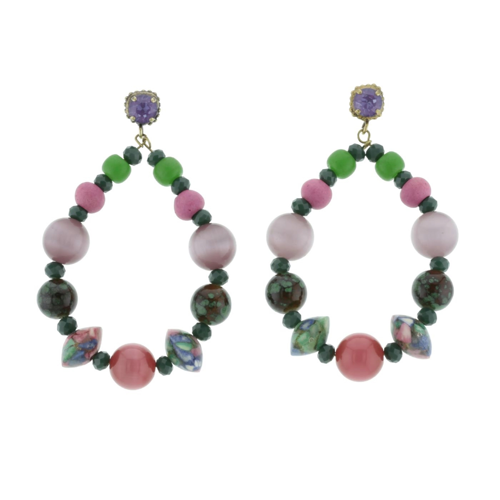 Clustdlysau cylch gyda strass, cerrig gwydr, gleiniau a pherlau. Cau gyda phin.