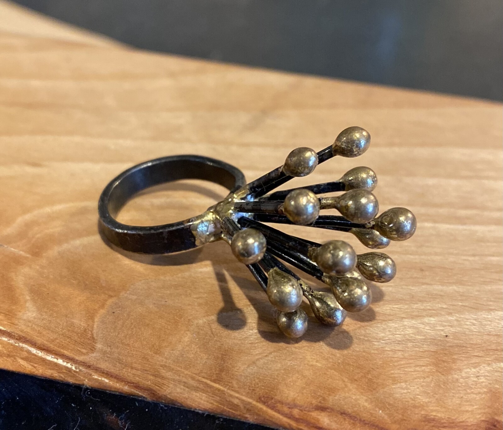 Modrwy haearn gyda manylion pres wedi ei chynllunio a’i gwneud gan y gof a’r gemydd rhyngwladol, Ann Catrin Evans.