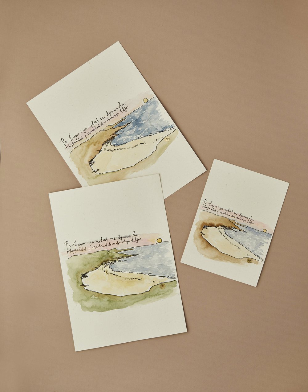 Print traeth Towyn gan Buddug gyda geiriau dwy linell gyntaf y gerdd ‘Pe bawn i yn artist’ gan T. Rowland Hughes.