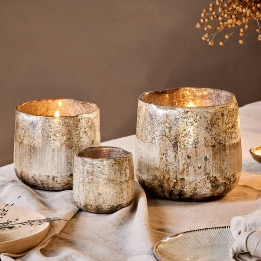 Llusern Nimit gyda gorffeniad hynafol trawiadol. Mae siap organig eu ymylon yn dangos y dulliau traddodiadol a ddefnyddir i’w creu. Wedi eu gwneud o wydr wedi eu ailgylchu. Ar gael mewn tri maint.