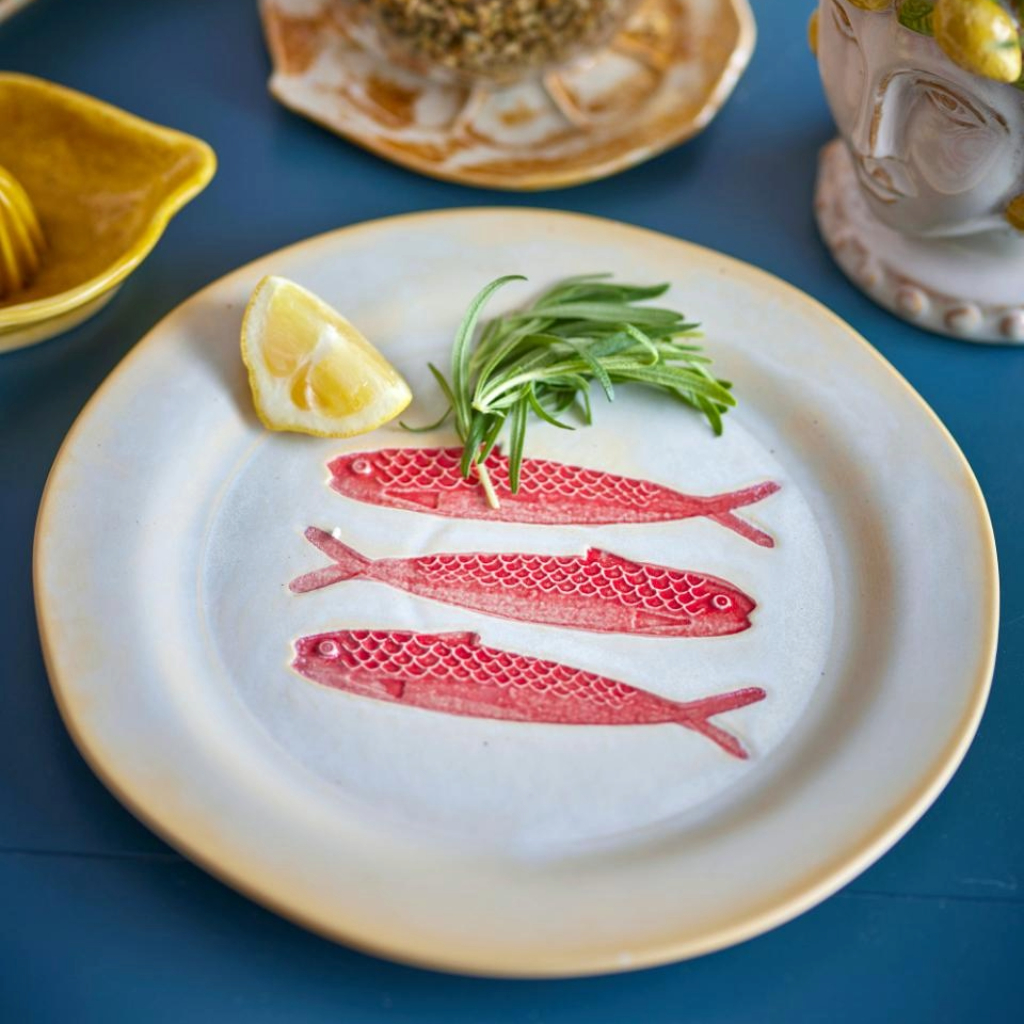 Plât crochenwaith gyda phatrwm pysgod coch.