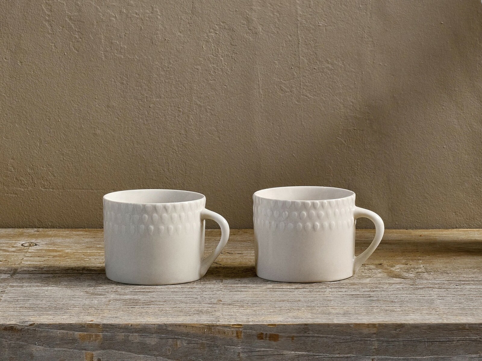 Mwg Ela mewn lliw hufen clasurol gyda phatrwm defnyn hardd ar draws ei wyneb, wedi’i greu gan ddefnyddio techneg arbenigol sy’n cynnwys llawer iawn o sgil.