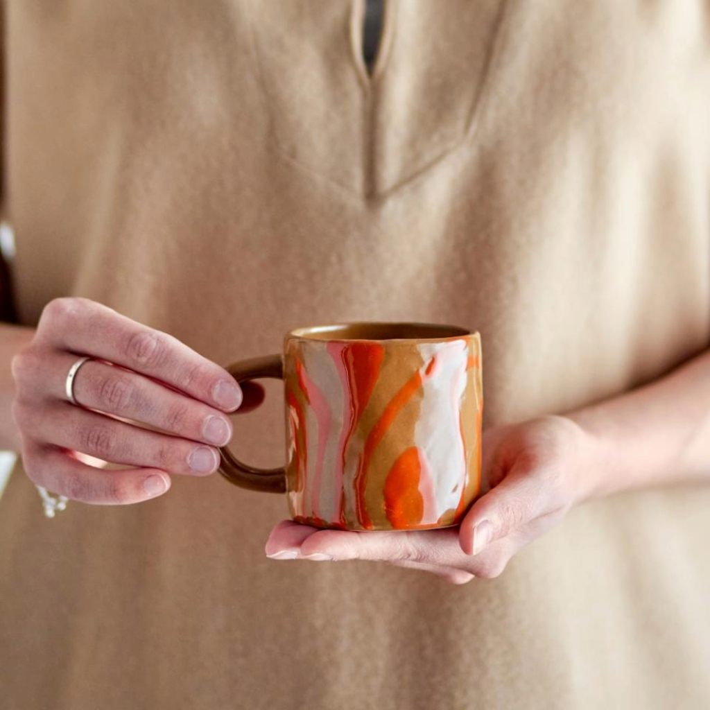 Mae gan y mwg crochenwaith oren yma siâp a maint clasurol, sy’n ei wneud yn berffaith ar gyfer mwynhau’ch hoff ddiod poeth.