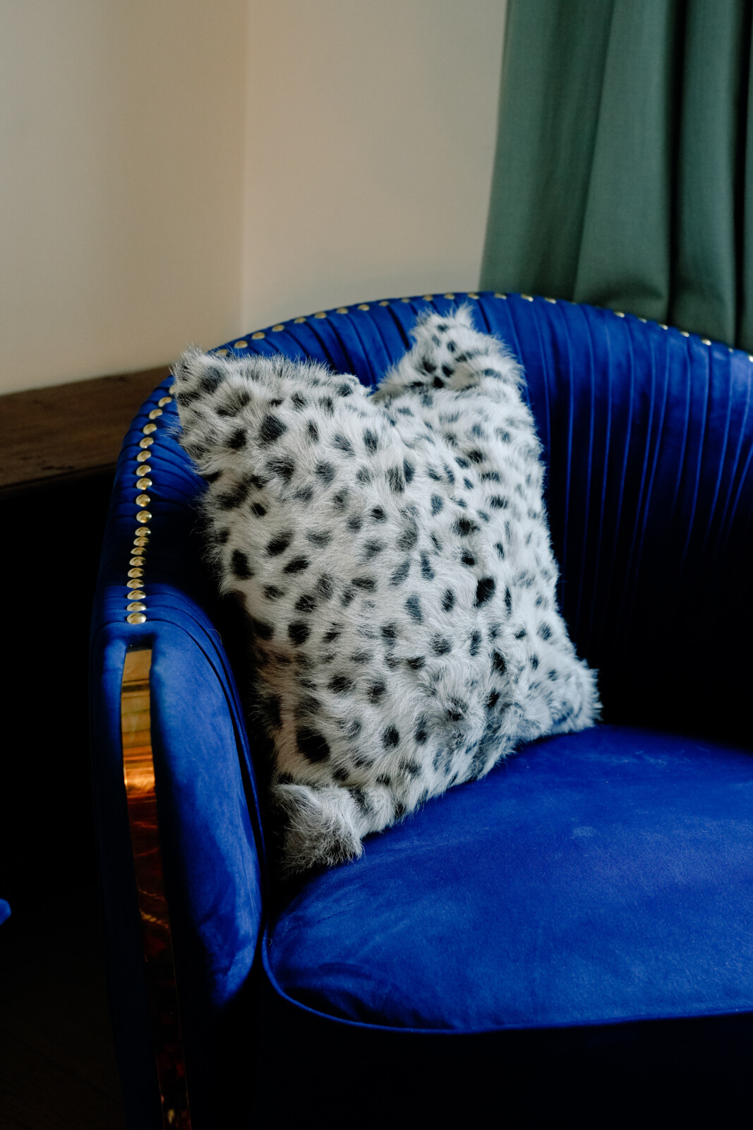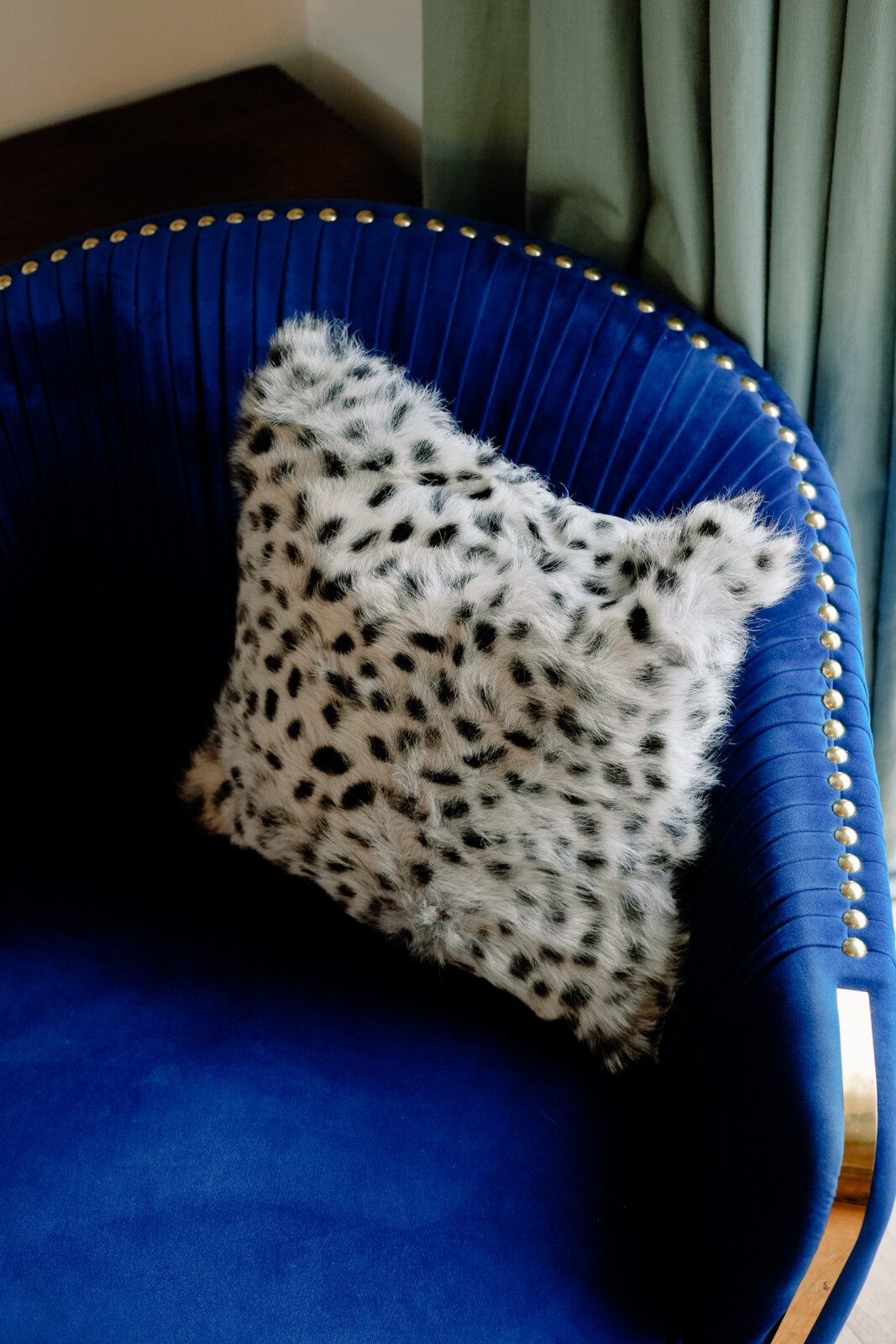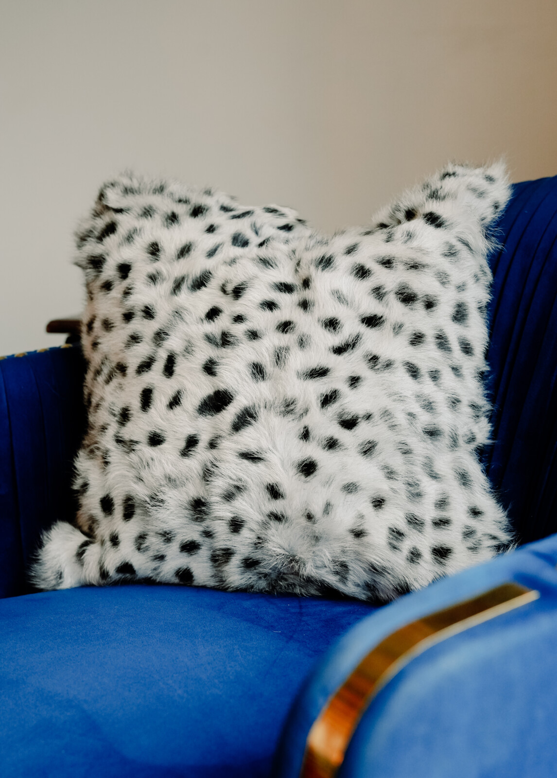 Gorchudd clustog croen gafr gyda cynllun llewpart. Mae’n gyfoes ac yn drawiadol.