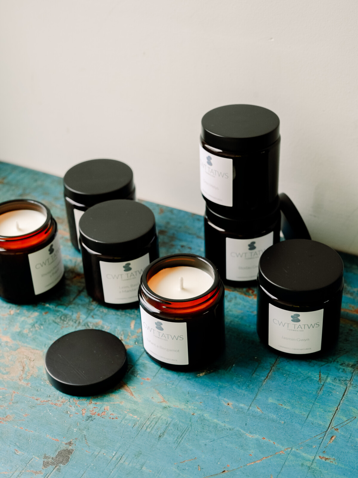 Wedi eu gwneud yn arbennig ar gyfer Cwt Tatws, mae’r casgliad yma o ganhwyllau cwyr naturiol yn fendigedig.