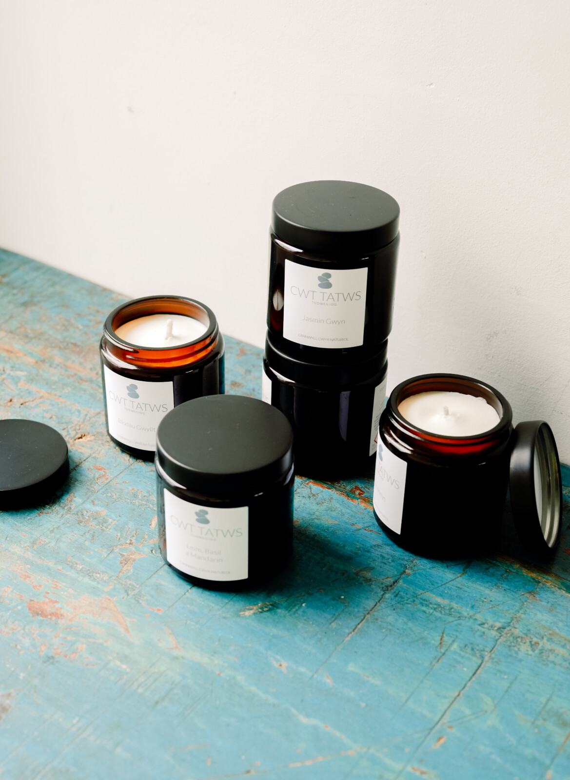 Wedi eu gwneud yn arbennig ar gyfer Cwt Tatws, mae’r casgliad yma o ganhwyllau cwyr naturiol yn fendigedig.