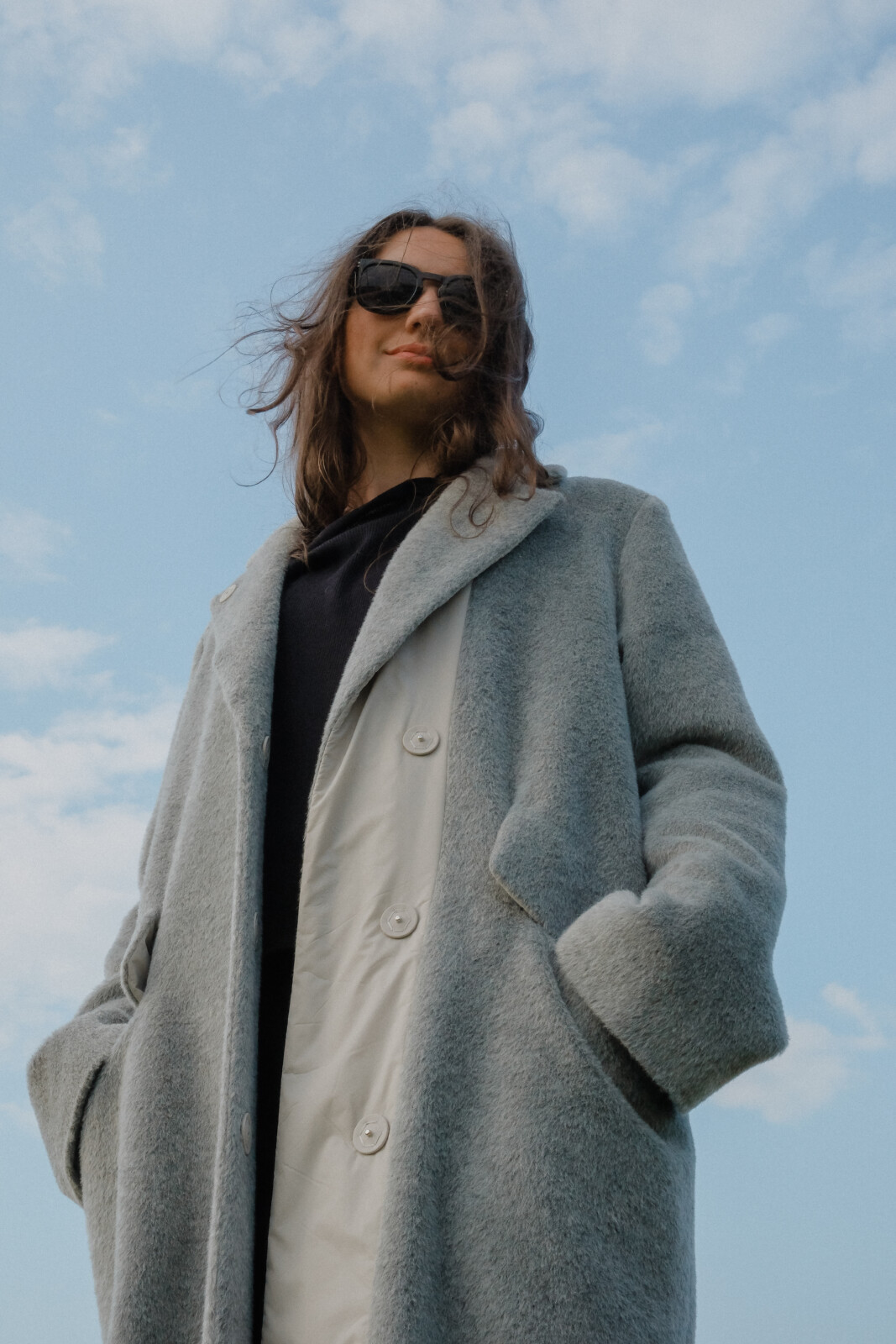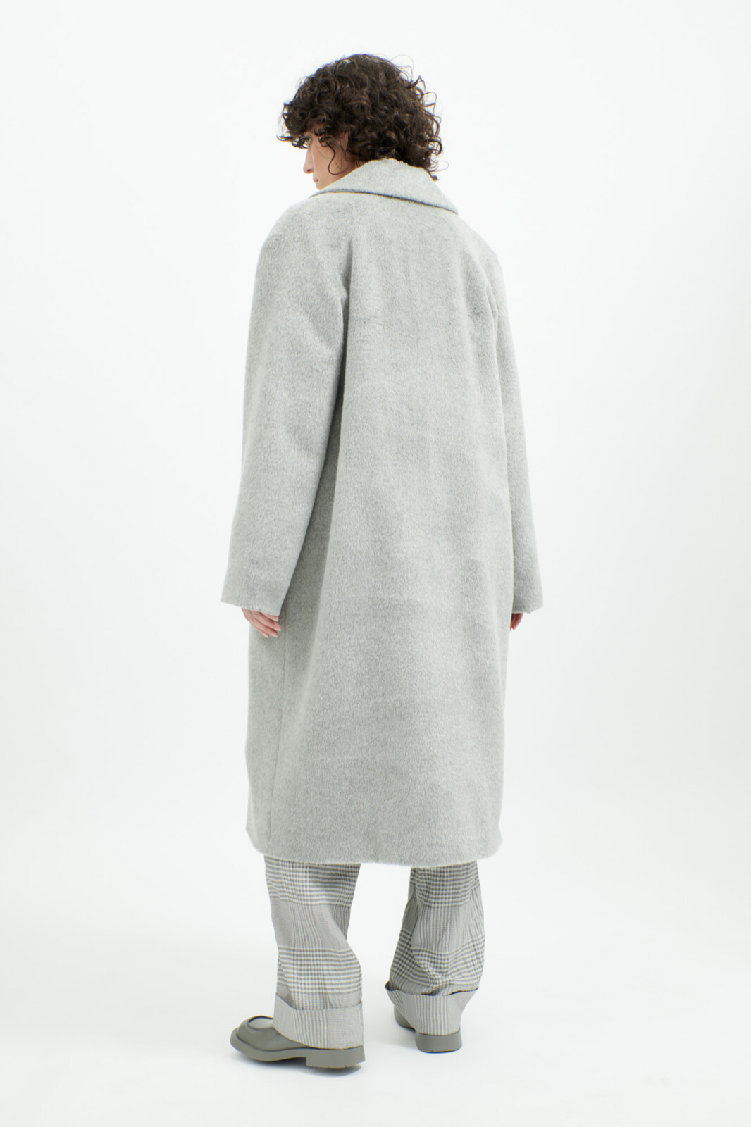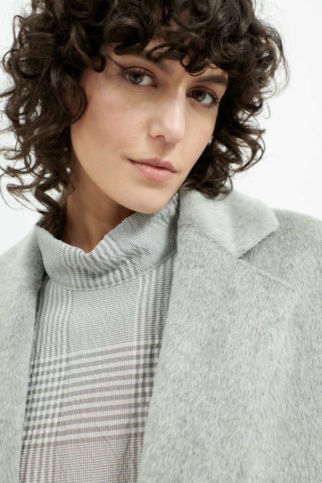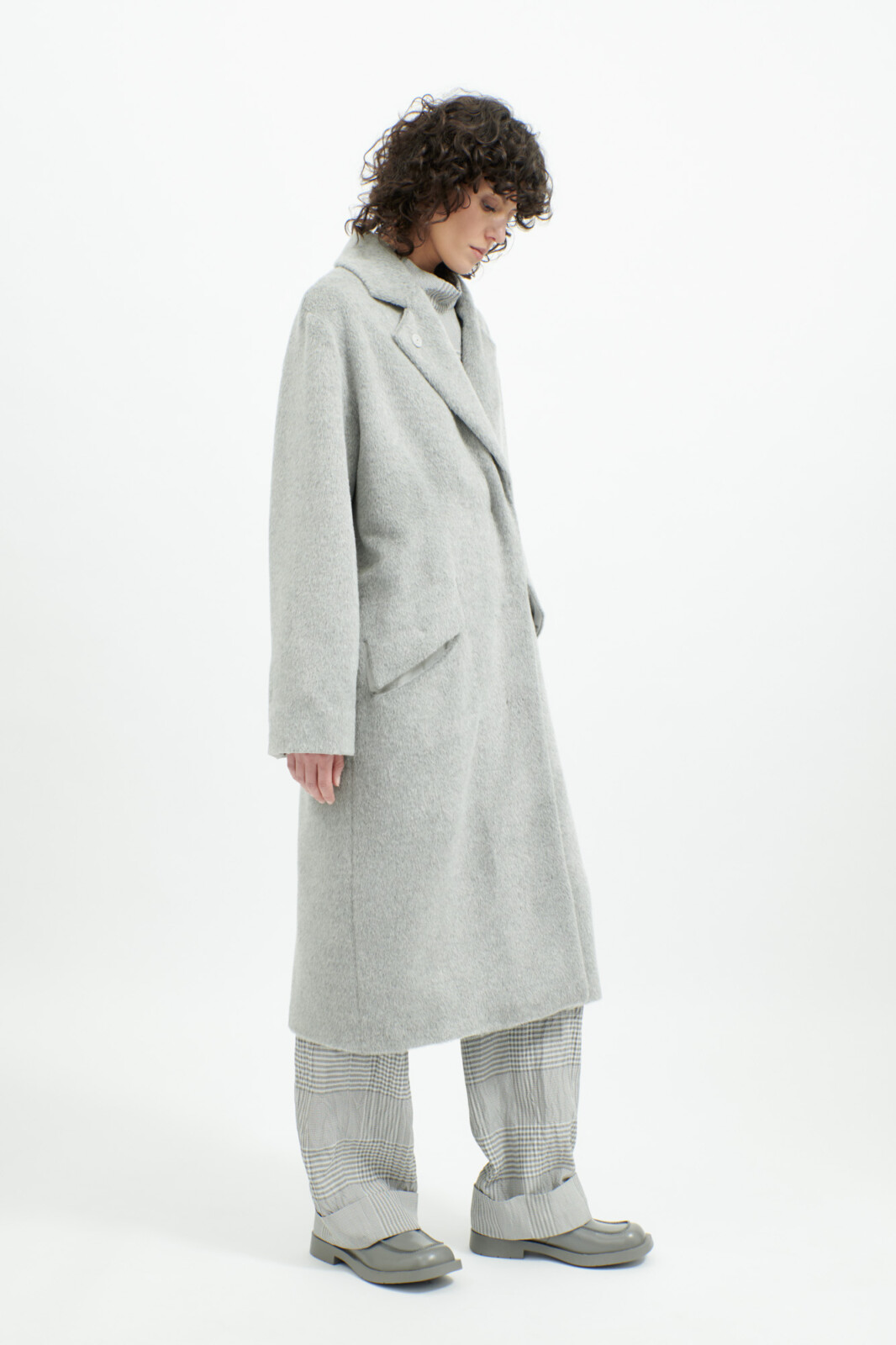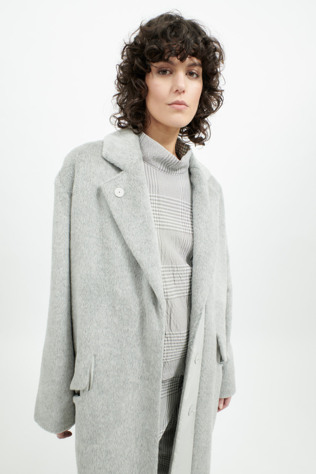Cót laes drawiadol a hynod o chwaethus. Mewn lliw llwyd golau.