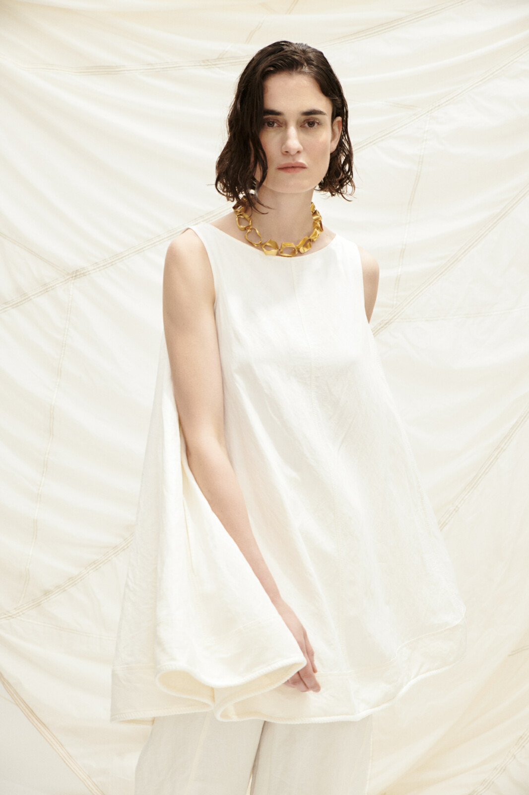 Ffrog gwta gyda silwet llydan iawn. Manylder applique ar yr hem.