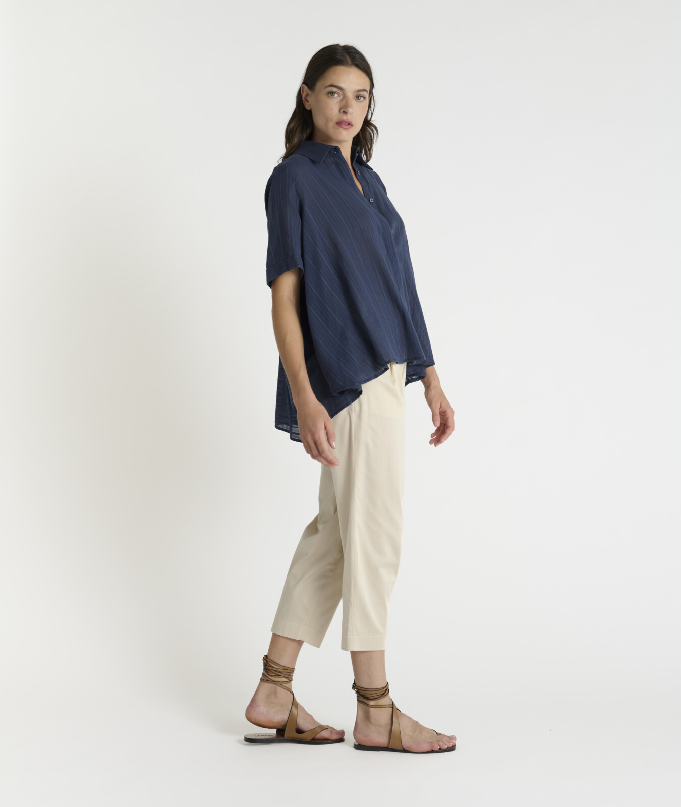 Crys cotwm hawdd i’w wisgo. Cau gyda botymau ar y blaen, coler gul a manylder plethan ar y cefn. 100% cotwm.