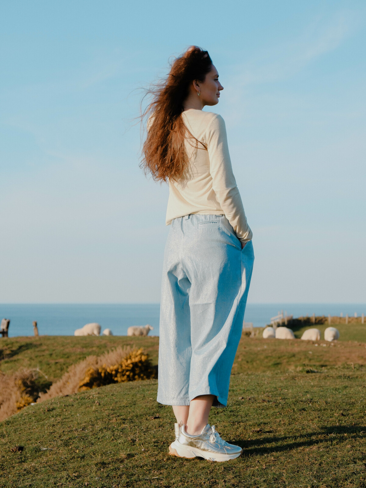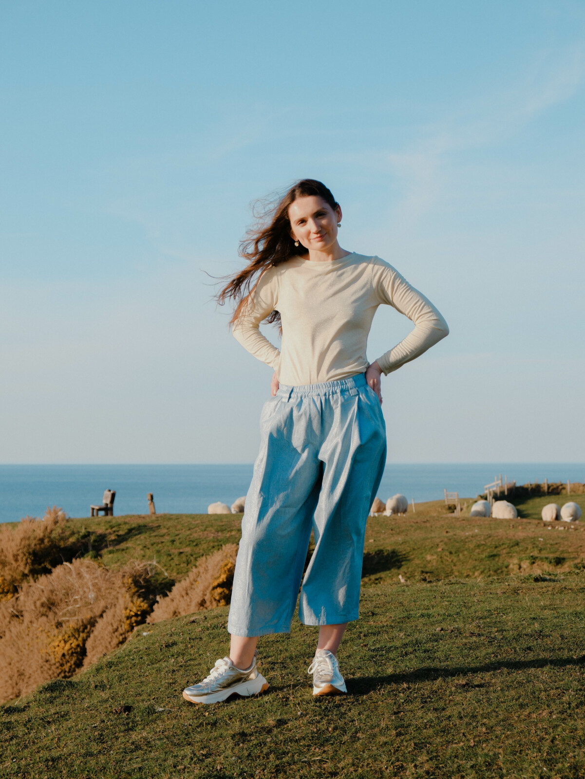 Trowsus steil hamddenol gyda sglein aur.