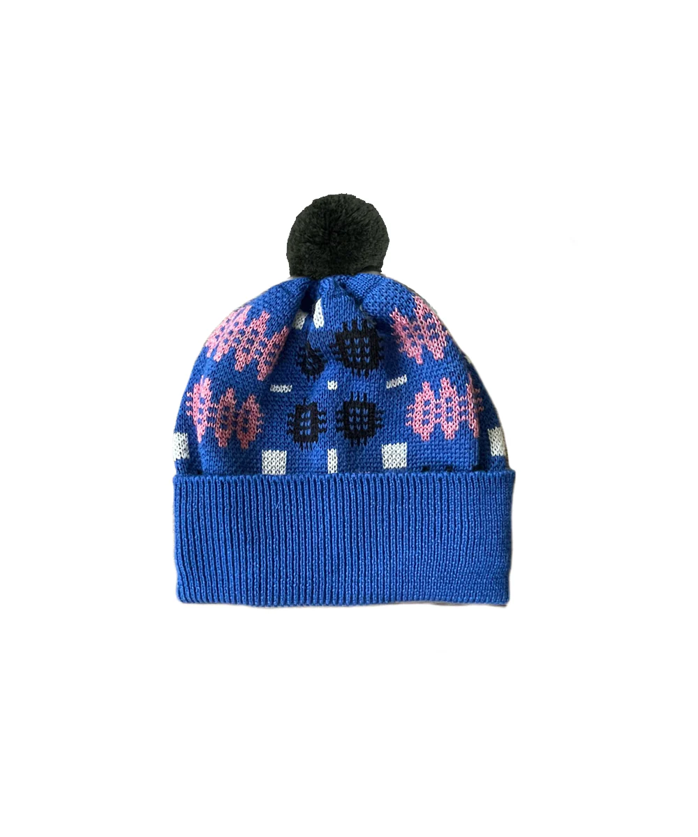 Cap steil ‘beanie’ mewn cynllun carthen a gyda pom pom.