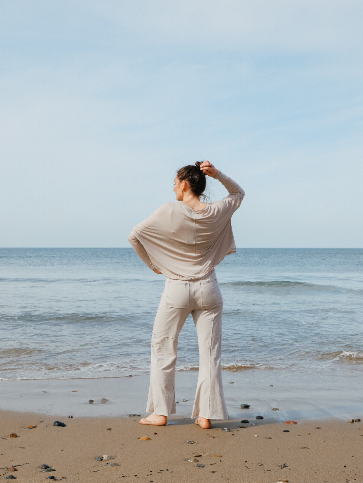 Top braf a llac, gyda llewys hir tynn a gwddw llydan.