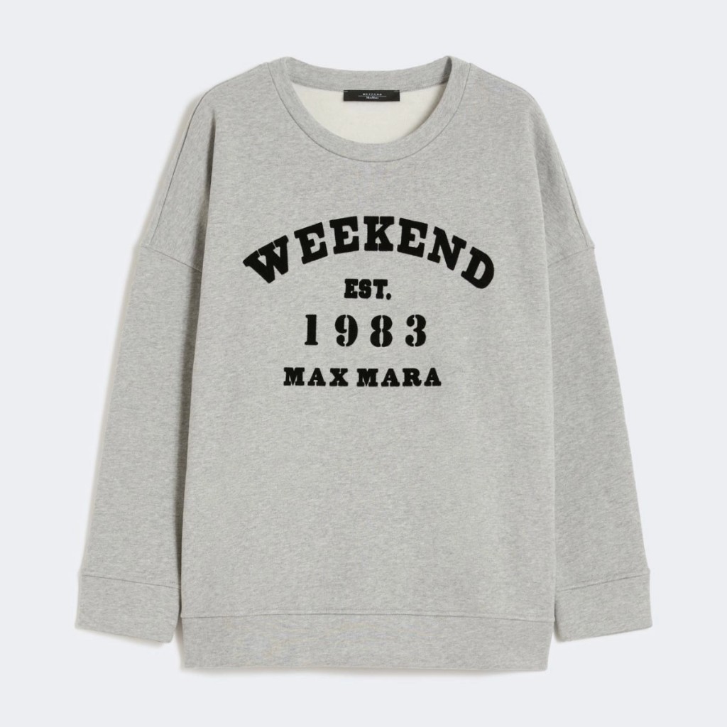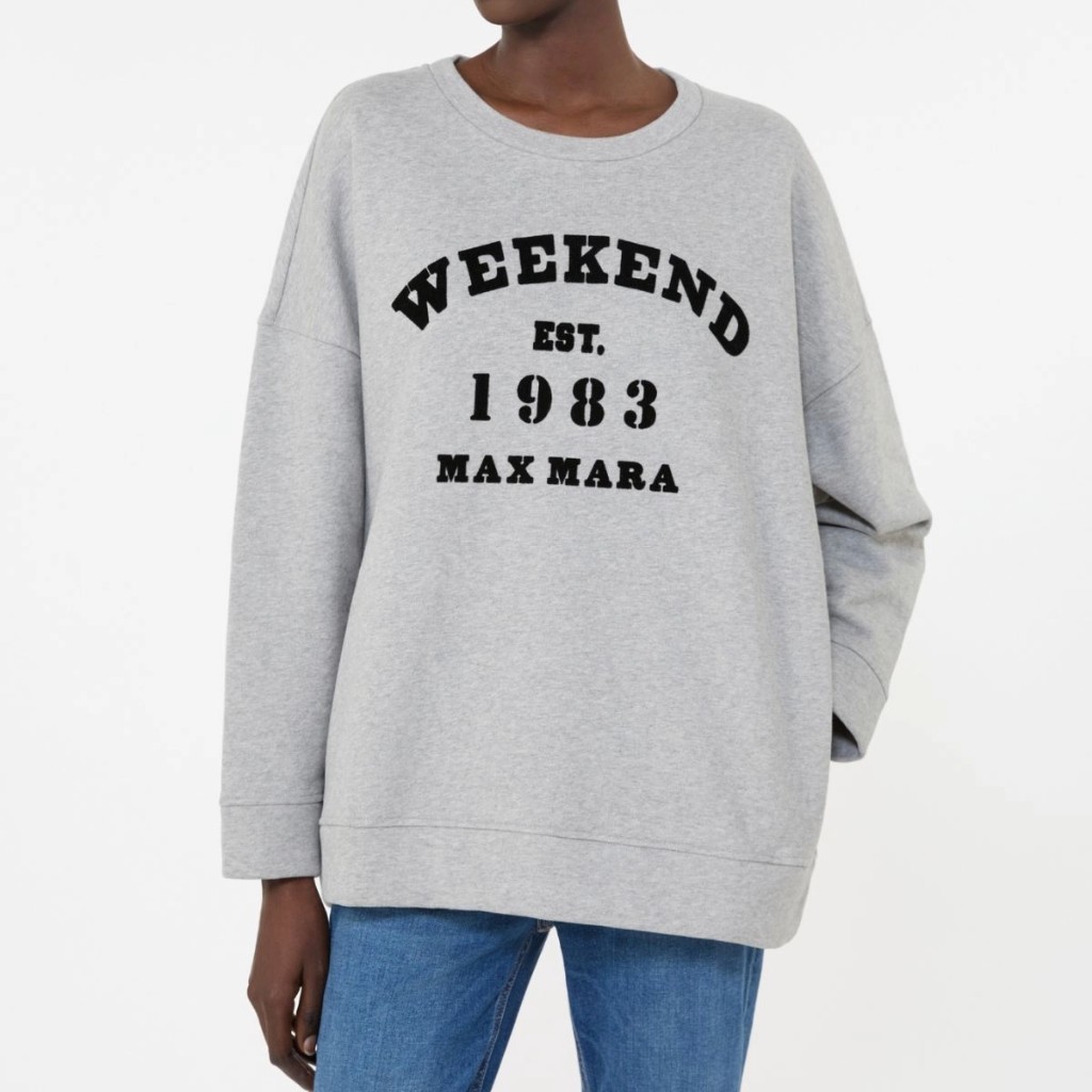 Siwmper lwyd gyda slogan Weekend Max Mara.