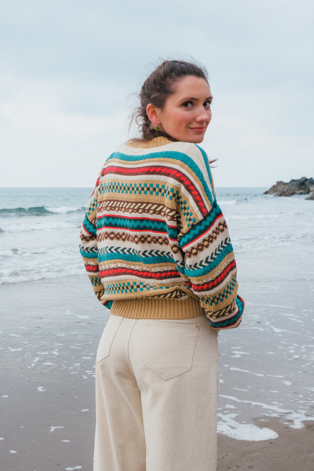 Siwmper llewys hir cotwm gyda cynllun fair isle.