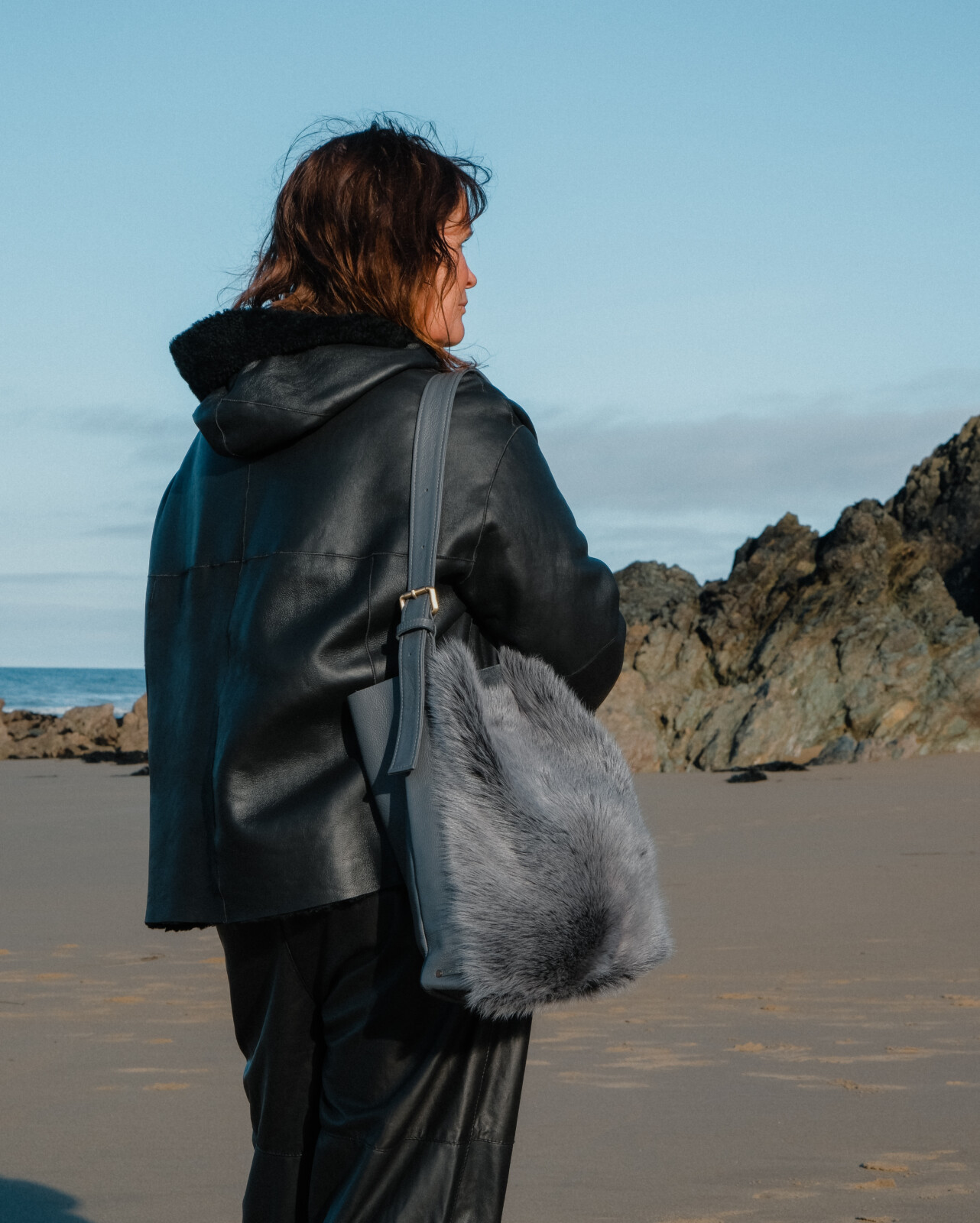 Bag steil ‘slouchy’ gyda chroen dafad ar un ochr a lledr esmwyth ar yr ochr arall. Defnyddiol a llawn steil.