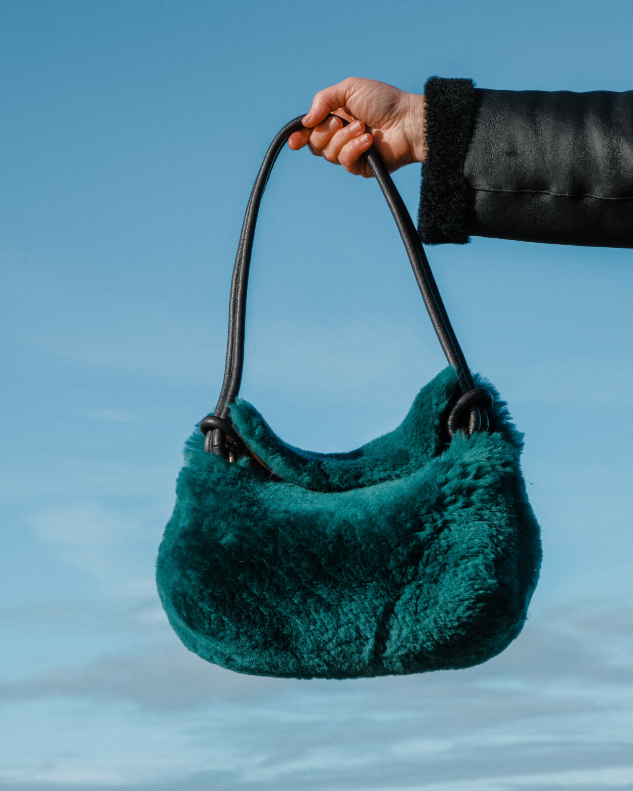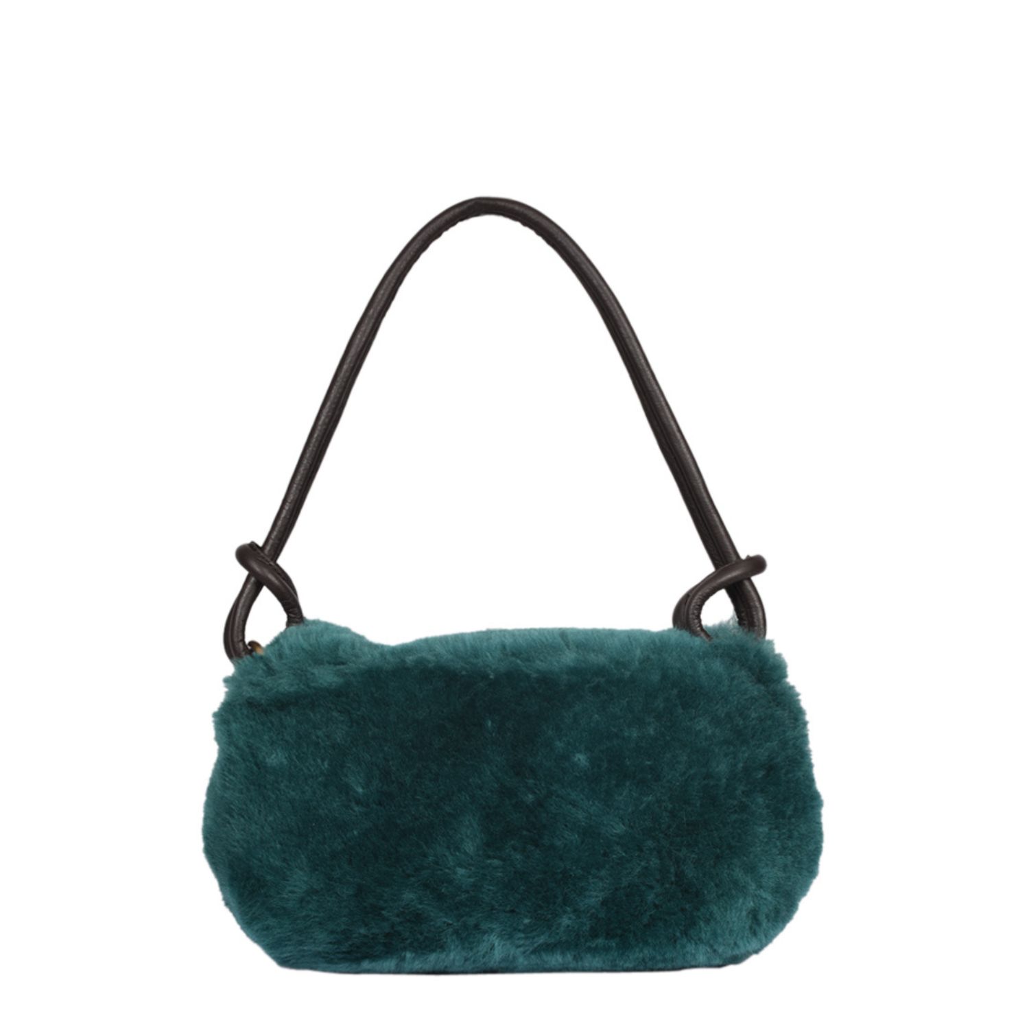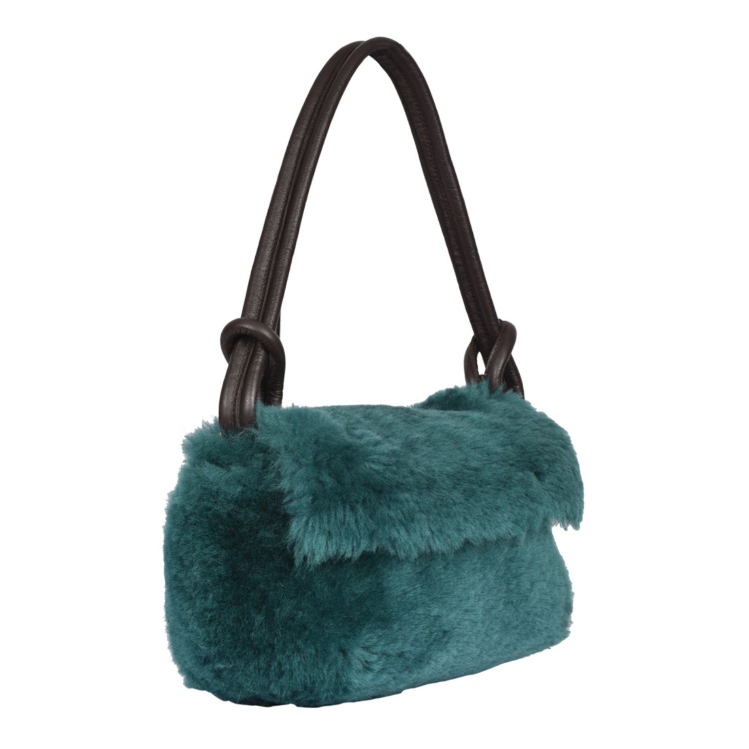 Bag ysgwydd lliw teal gyda handlen lledr.