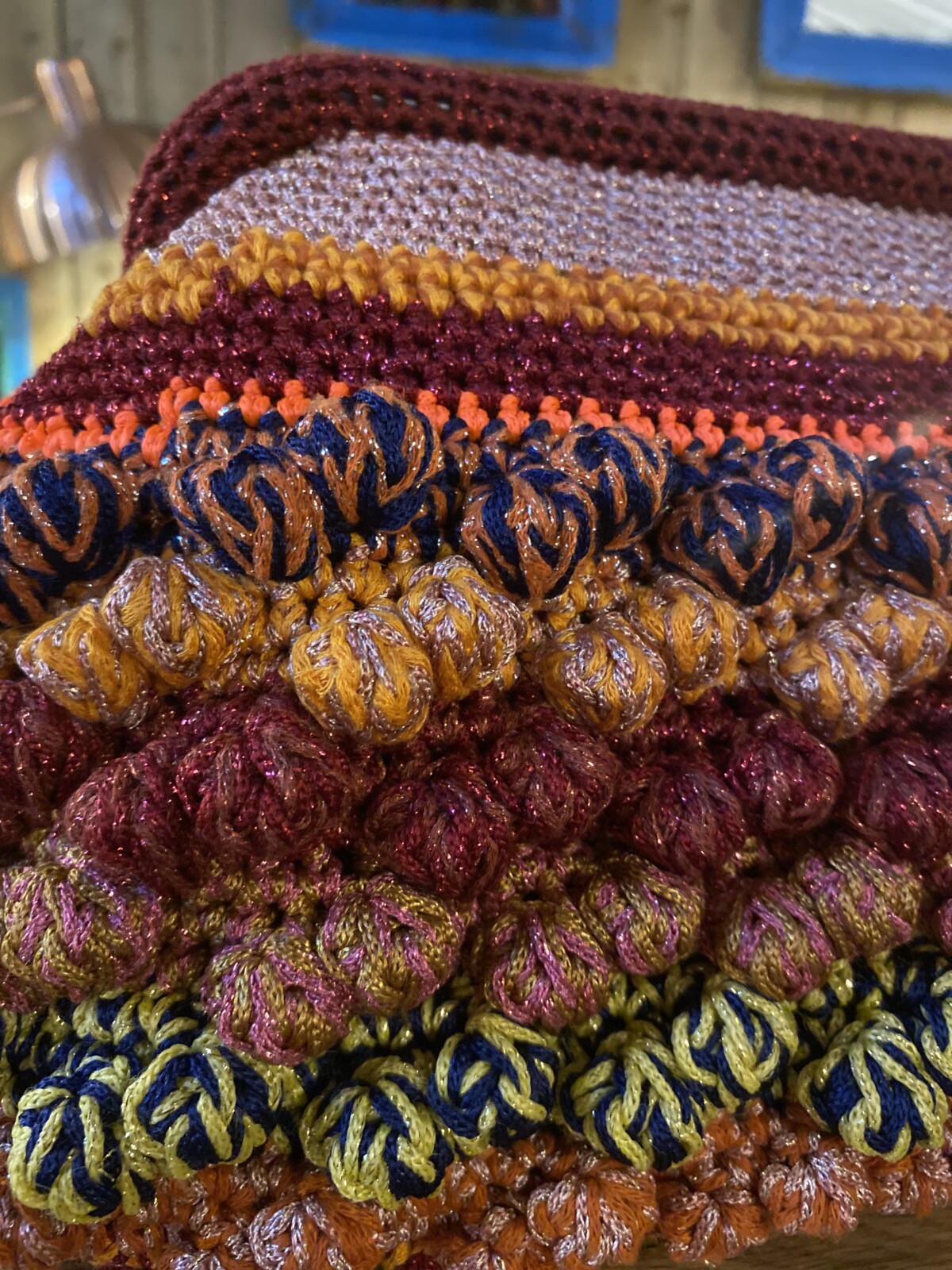 Bag popcorn hollol ffab! Wedi ei grosio â llaw, mae’r bag yma’n berffaith i ychwanegu pop o liw i unrhyw wisg.