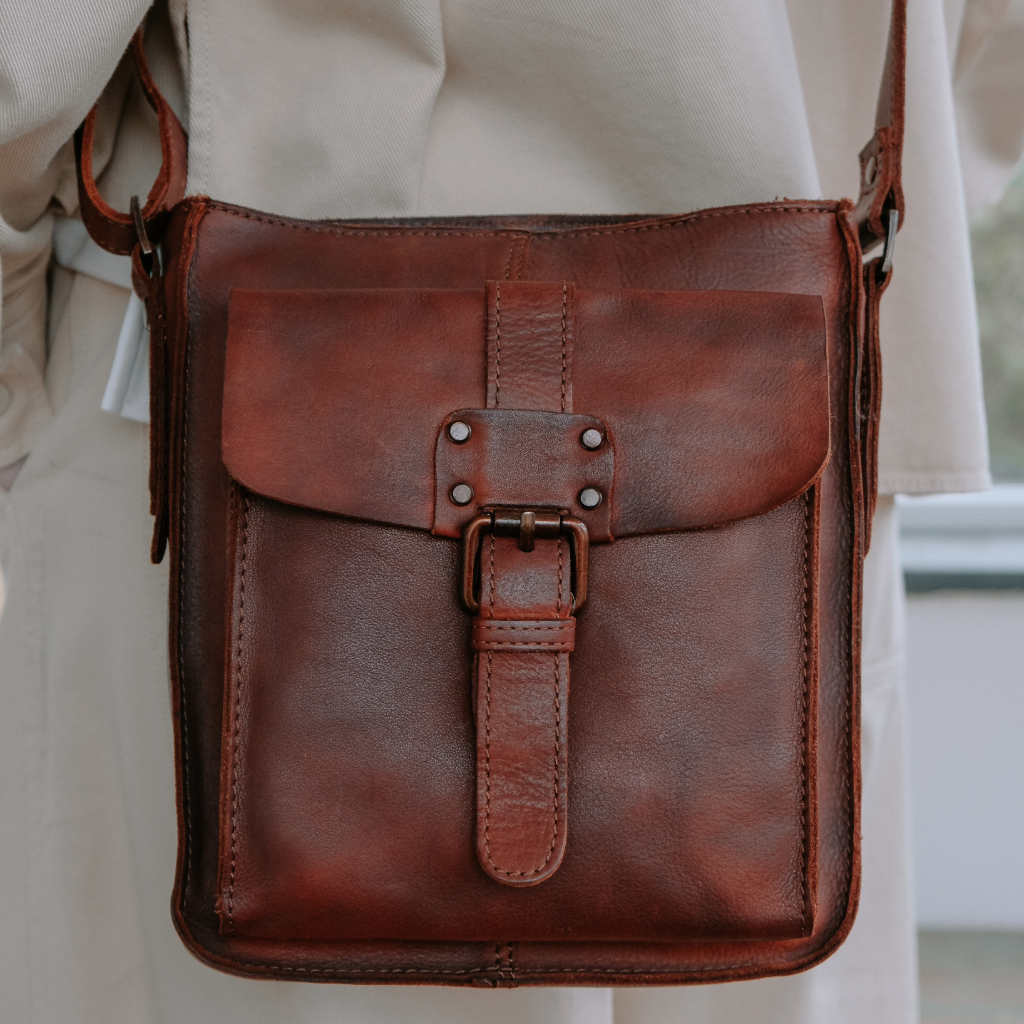 Bag lledr gyda pocedi zip a bwcl, tu mewn wedi’i leinio â chotwm, a strap cotwm a lledr addasadwy.