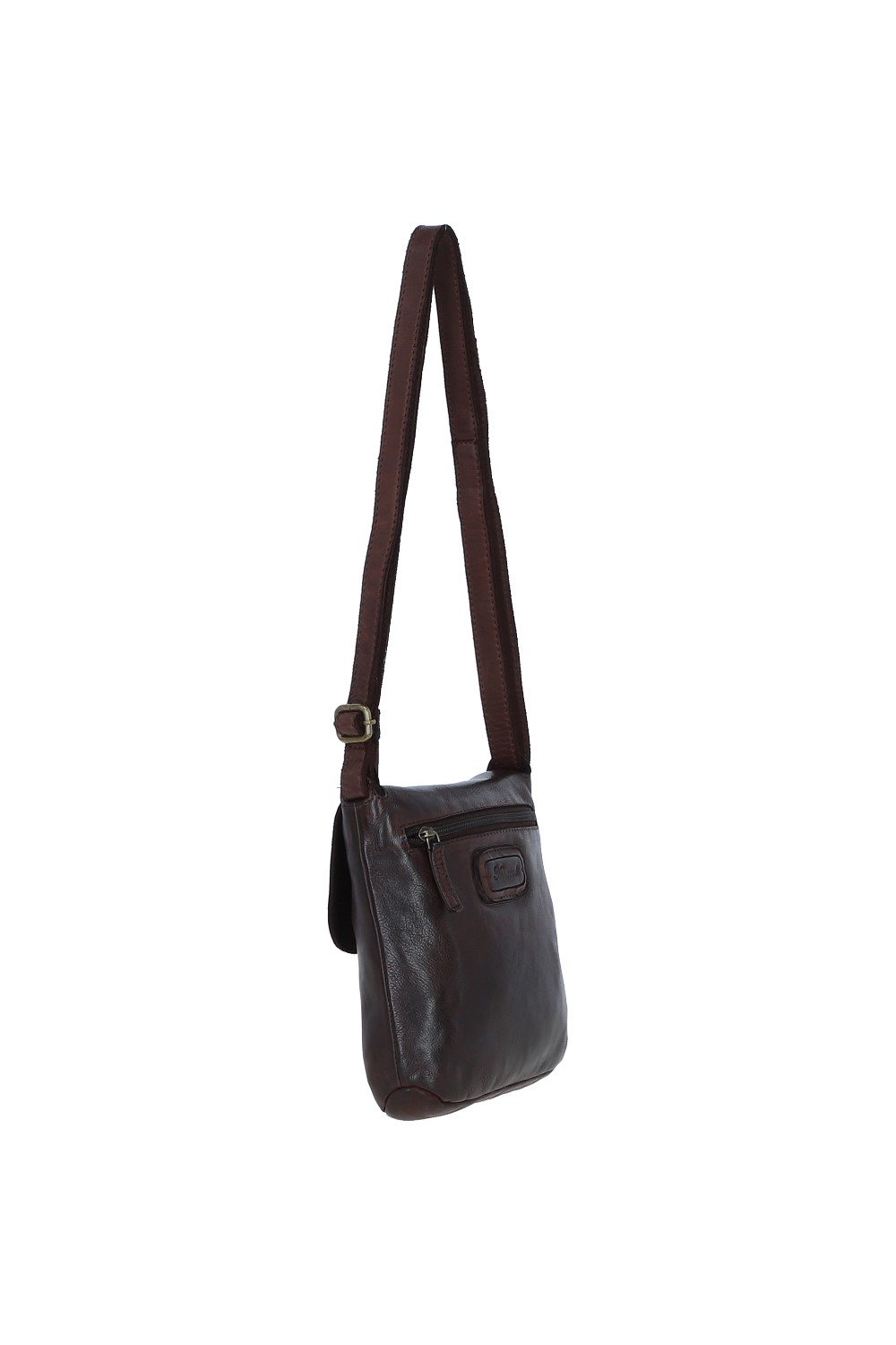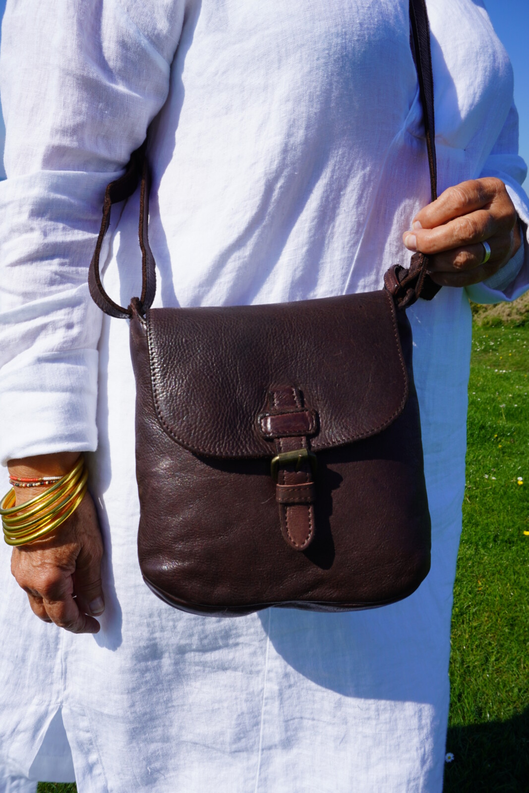 Bag lledr Jini, gyda poced sip blaen, fflap â bwcl a strap addasadwy.