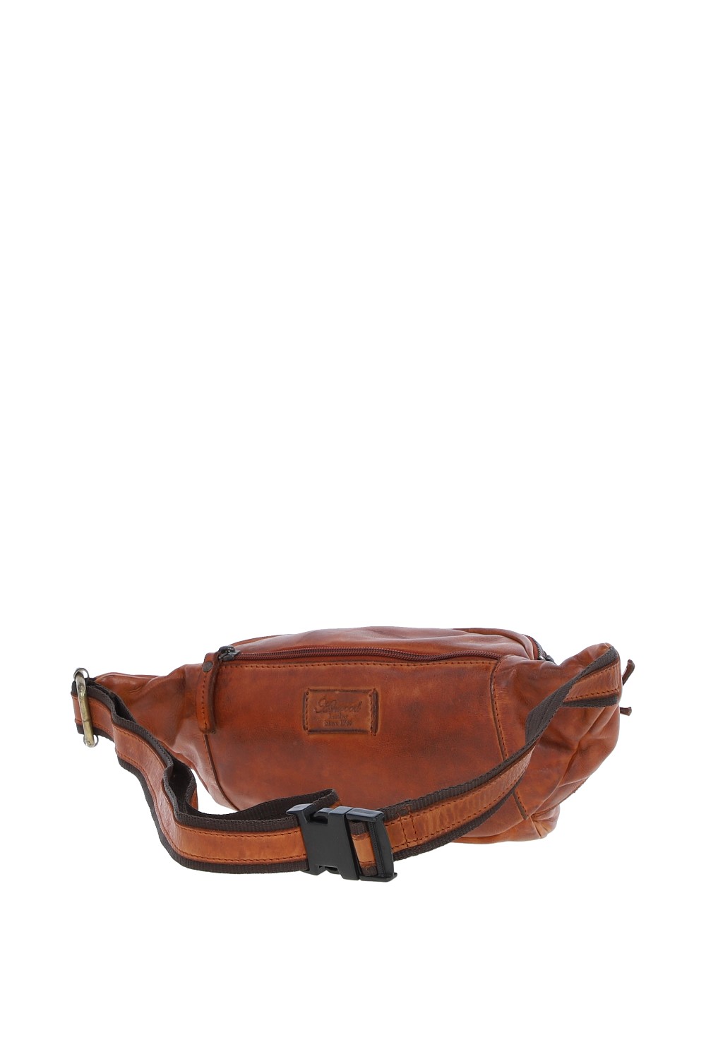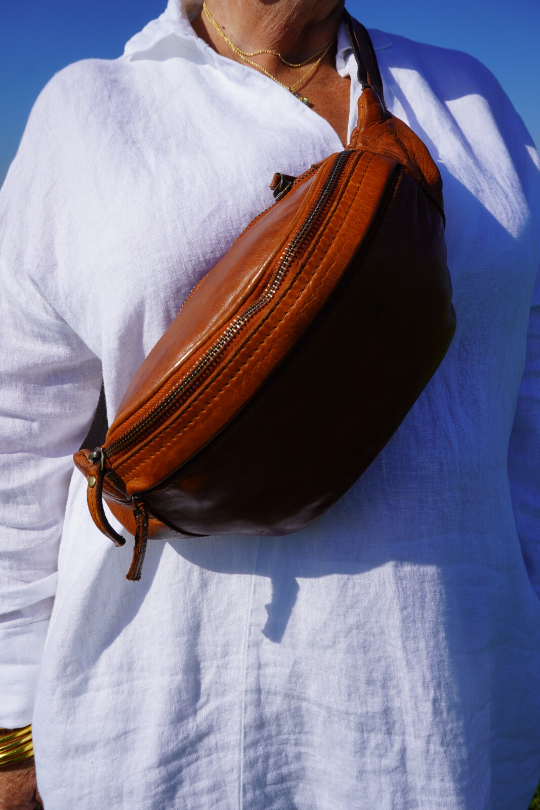 Bag lledr amlbwrpas gyda zip blaen a zip ôl.