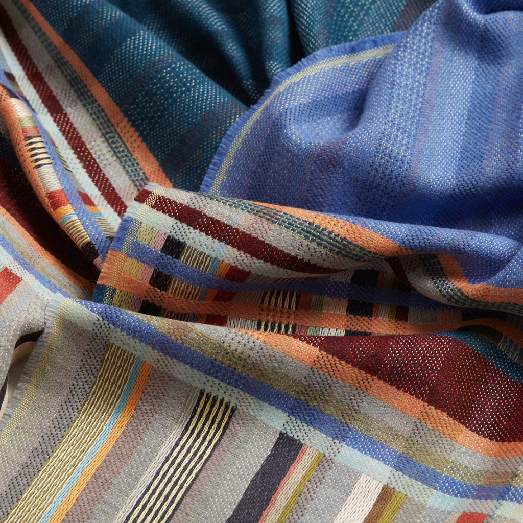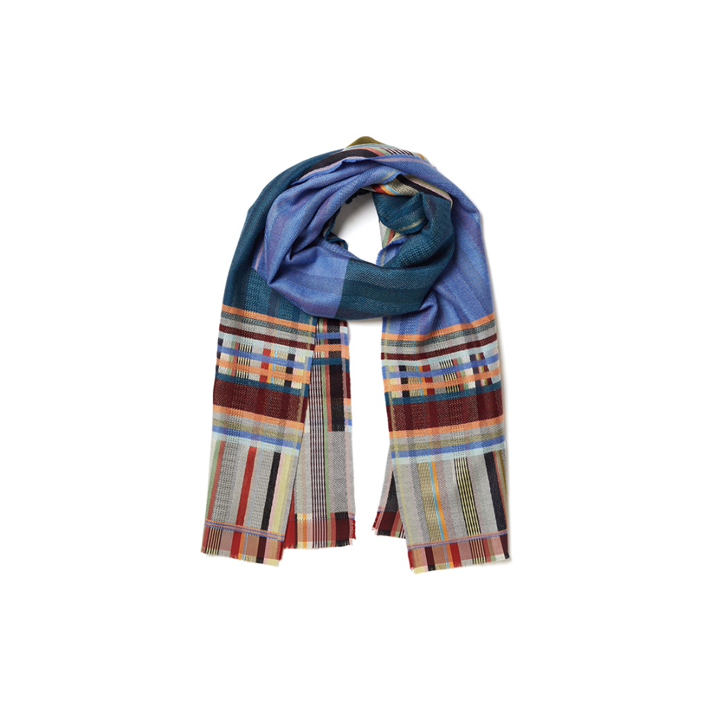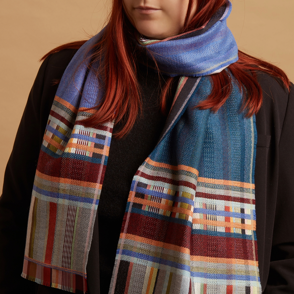 Sgarff moethus Wallace Sewell wedi ei wneud o 50% gwlân merino a 50% sidan. Wedi ei wehyddu ym Mhrydain.