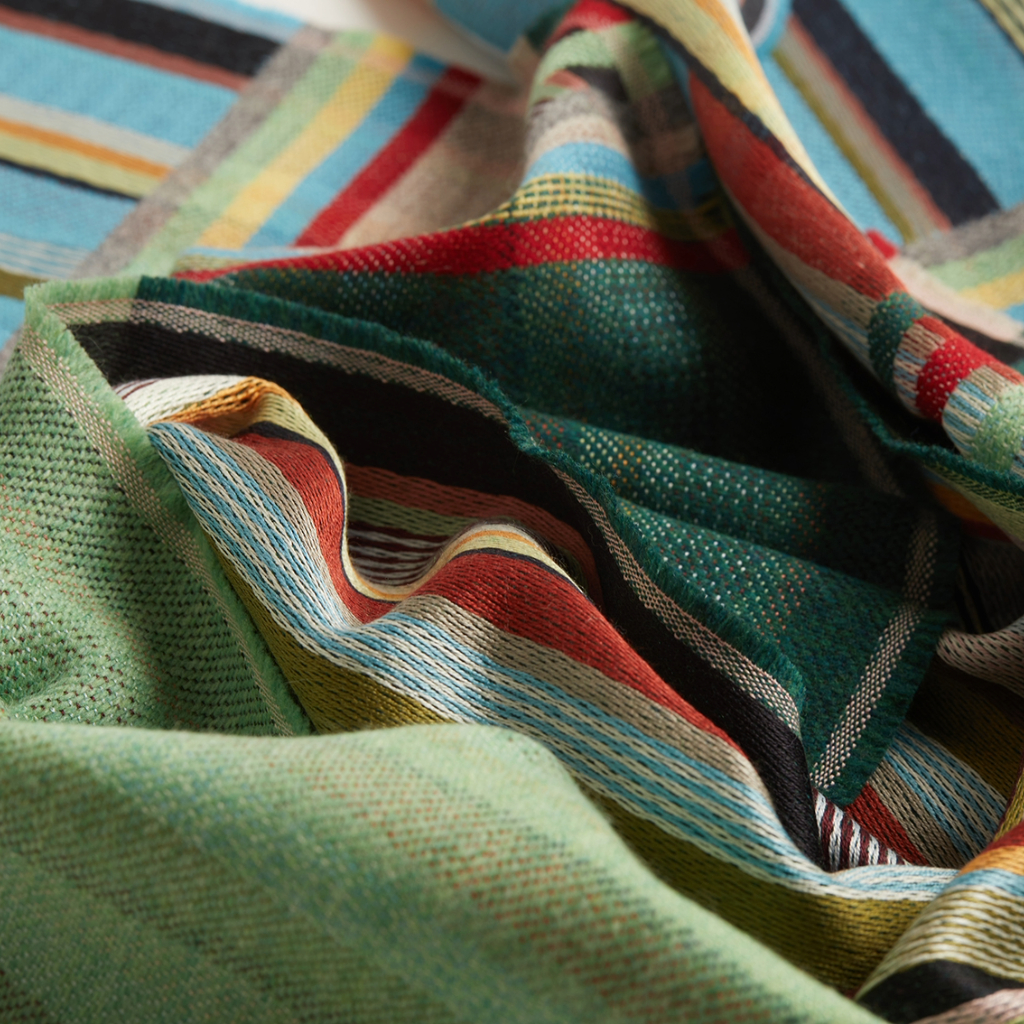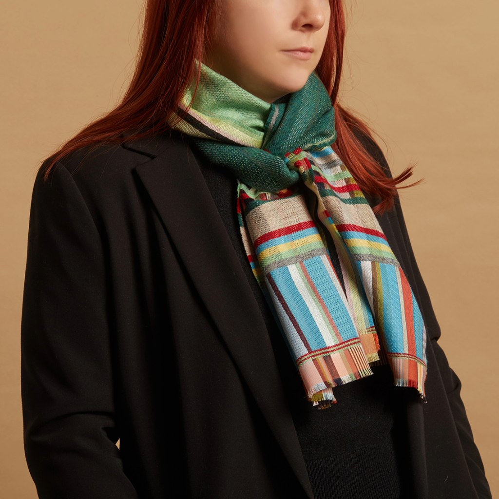 Sgarff moethus Wallace Sewell wedi ei wneud o 50% gwlân merino a 50% sidan. Wedi ei wehyddu ym Mhrydain.