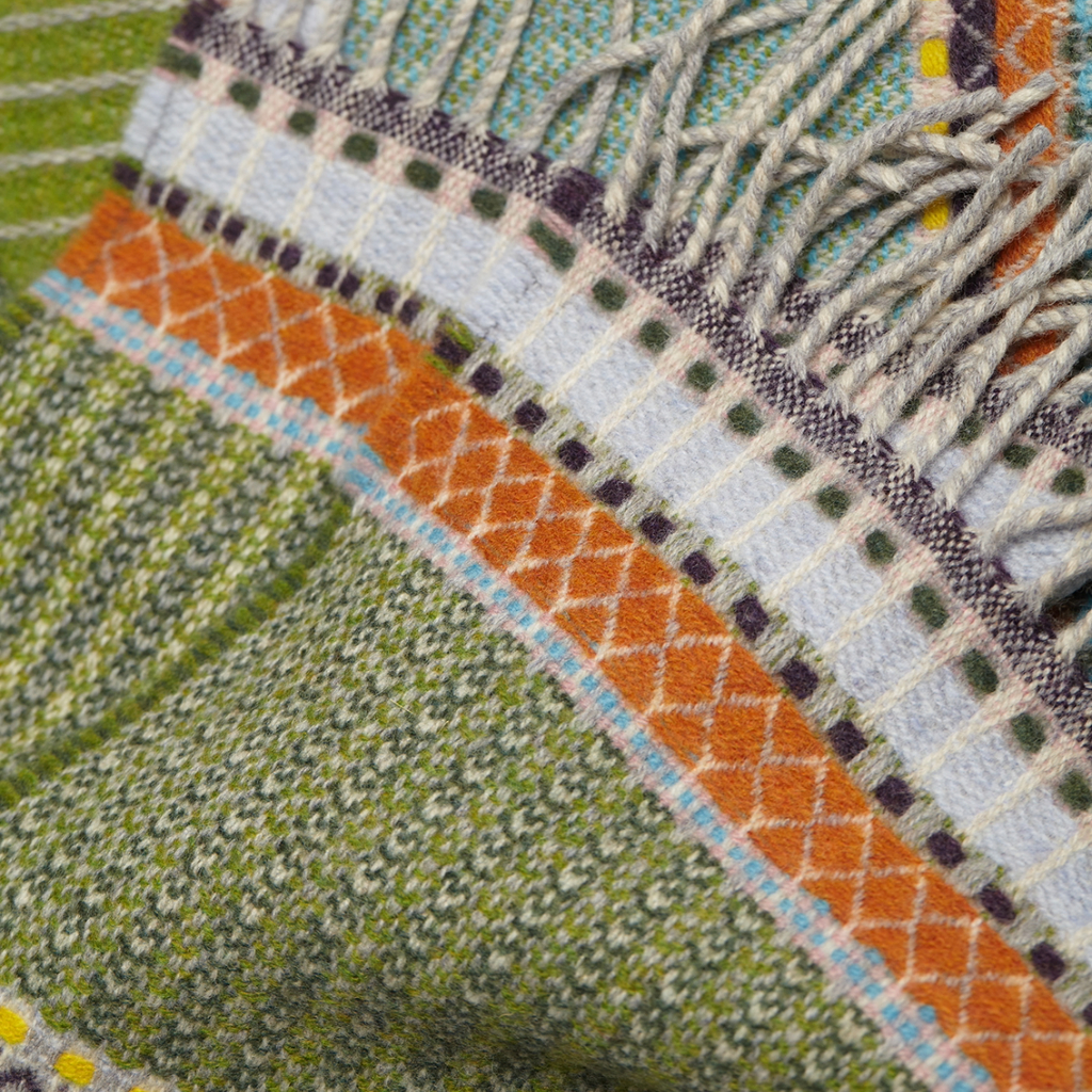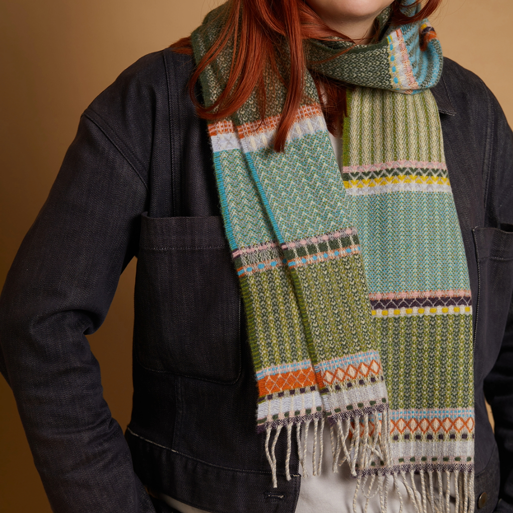 Sgarff meddal Wallace Sewell wedi ei wneud o wlân merino. Wedi ei nyddu yn Sir Efrog a’i wehyddu yn Sir Gaerhirfryn.