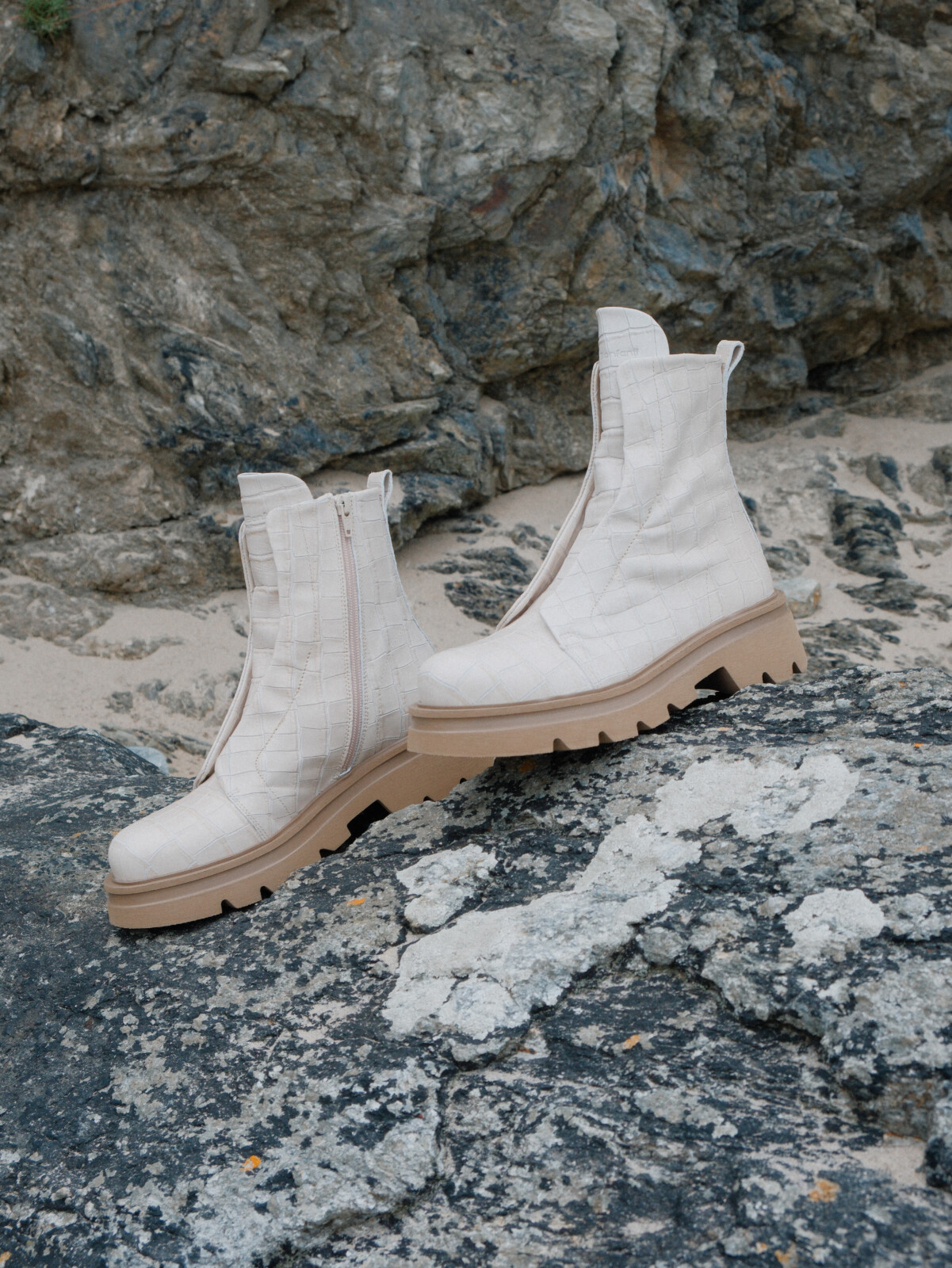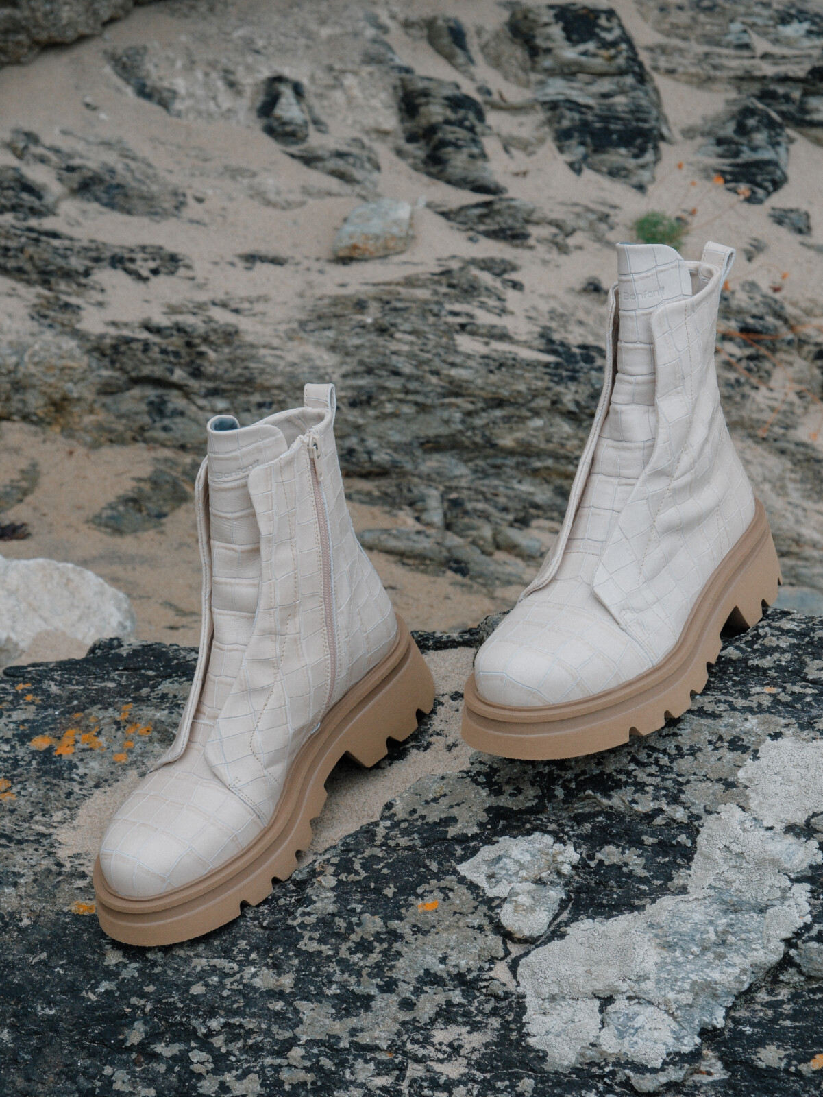 Esgidiau Kuni clasurol gan Patrizia Bonfanti mewn lledr lliw naturiol gyda manylyn print anifeiliaid. Wedi eu gwneud â llaw yn yr Eidal.