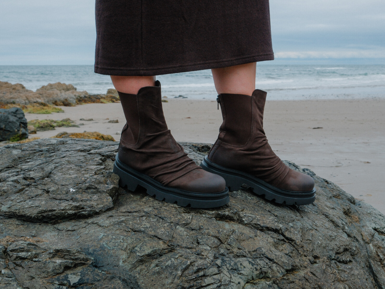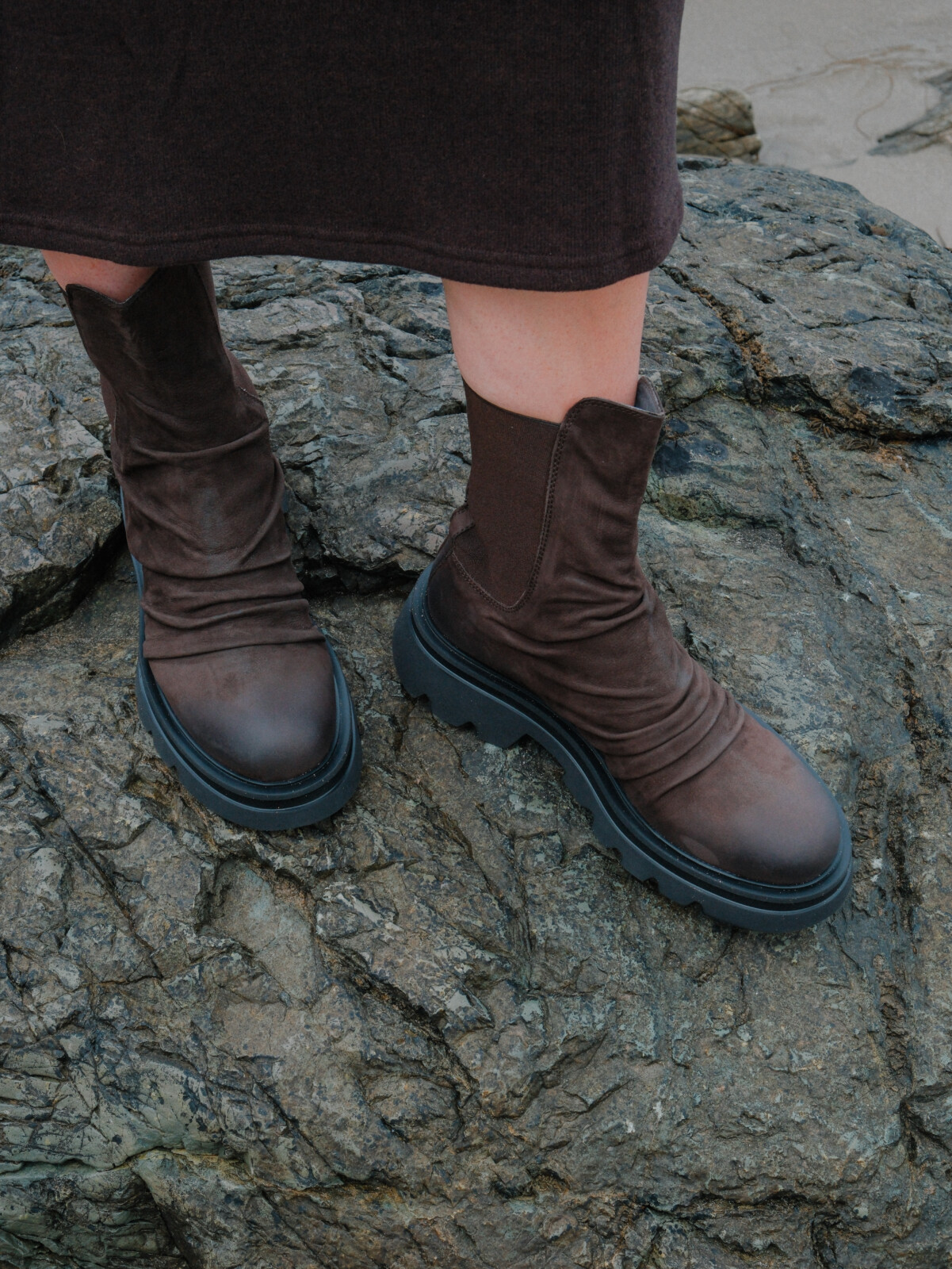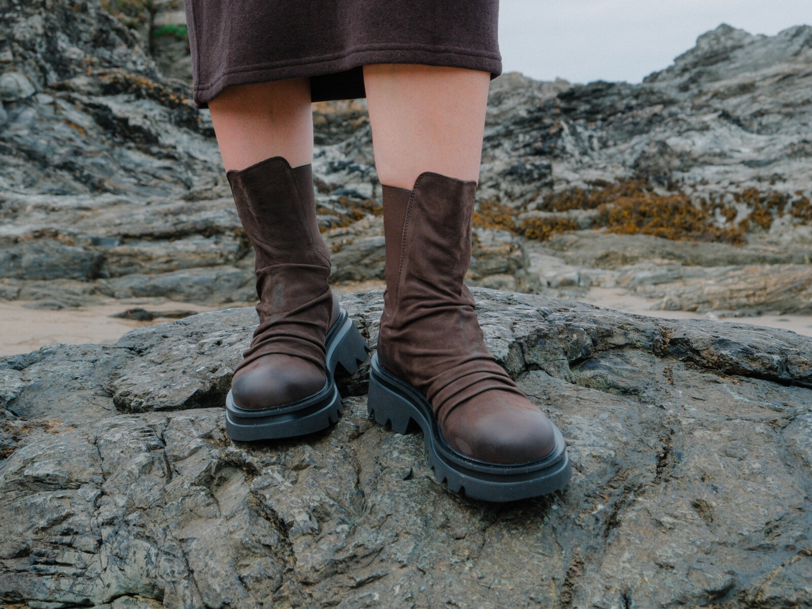 Esgidiau lledr meddal gyda sawdl drwchus a phlygiadau unigryw. Wedi eu gwneud â llaw yn yr Eidal.