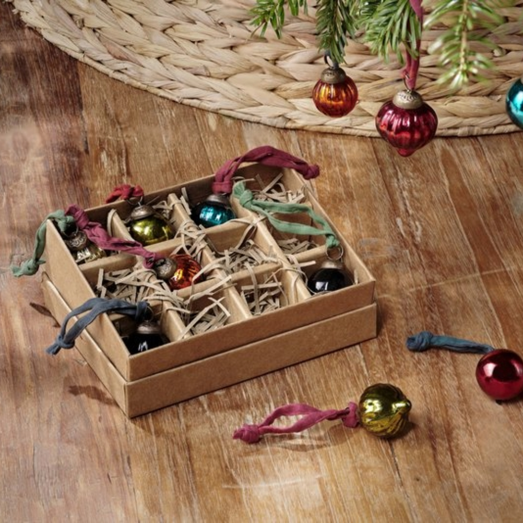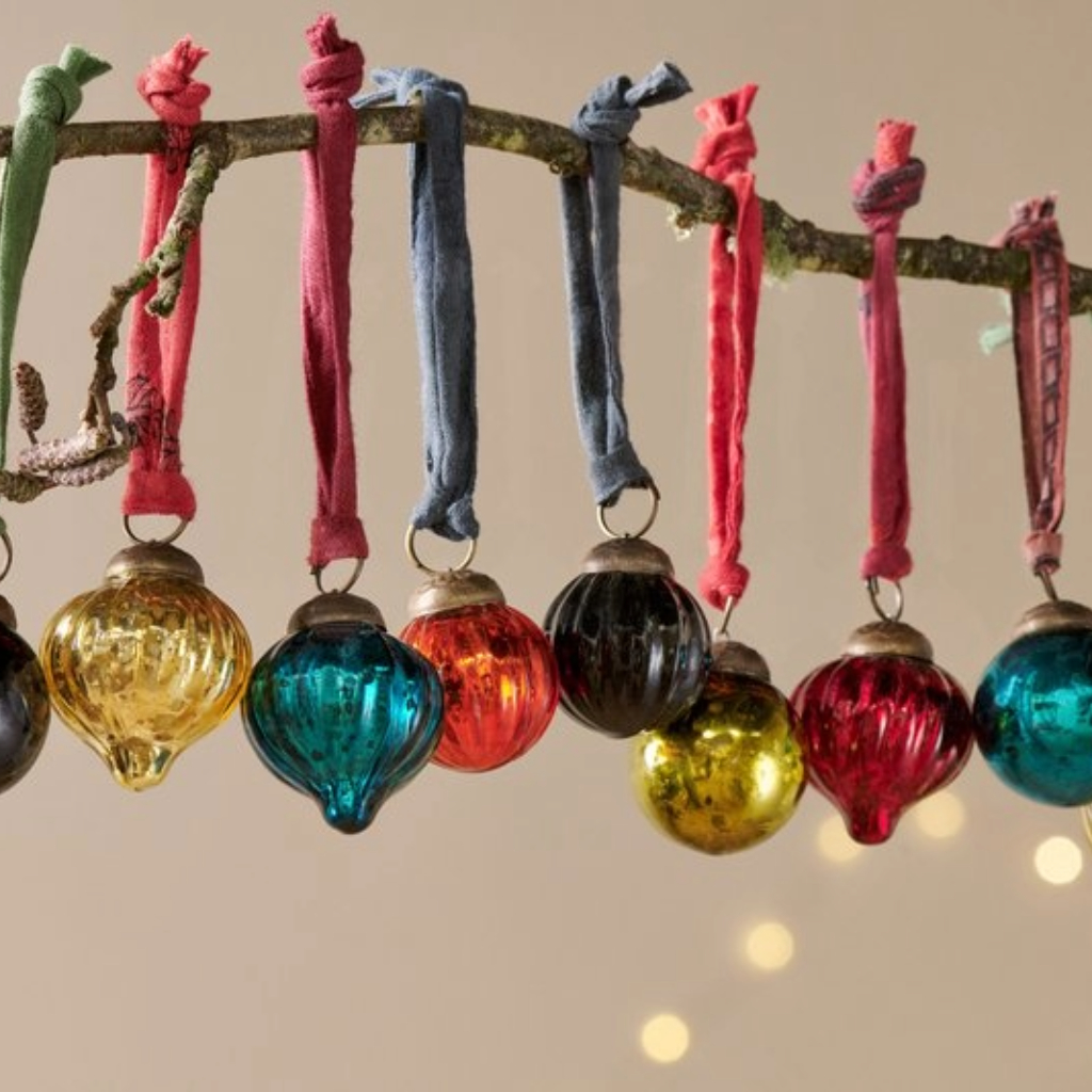 These set of 12 dew drop baubles provide a waterfall of rich antique colour to any festive decor. The gorgeous jewel-like shades of these exquisitely shaped baubles make them a wonderful finishing touch to a sumptuously decked-out tree or bare branch display. Finished with an antique-style clasp and elegant sari tie.