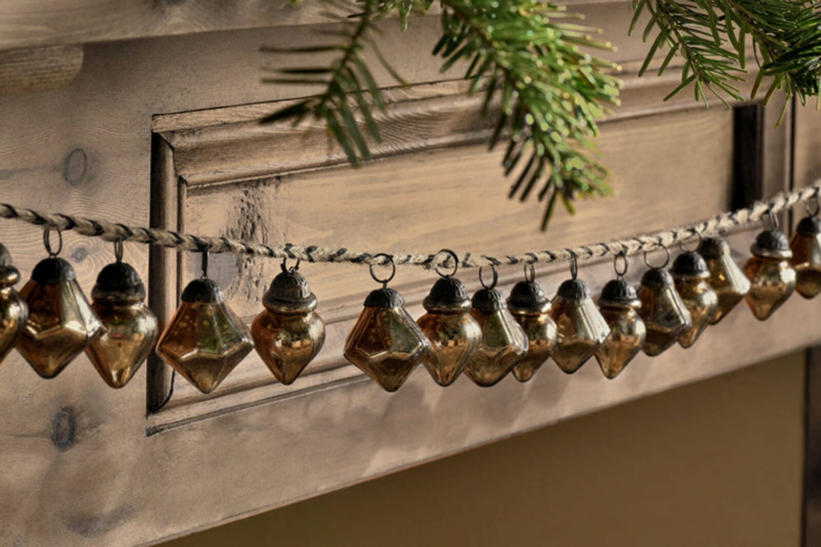 Antique gold is the perfect hue for decorating your home during the festive season. The Ekiti bauble garland combines this refined colour tone with elegantly shaped recycled glass baubles strung along a natural jute garland. The garland has two practical hooks at each end looking stunning strung across a fireplace or placed on a tree.