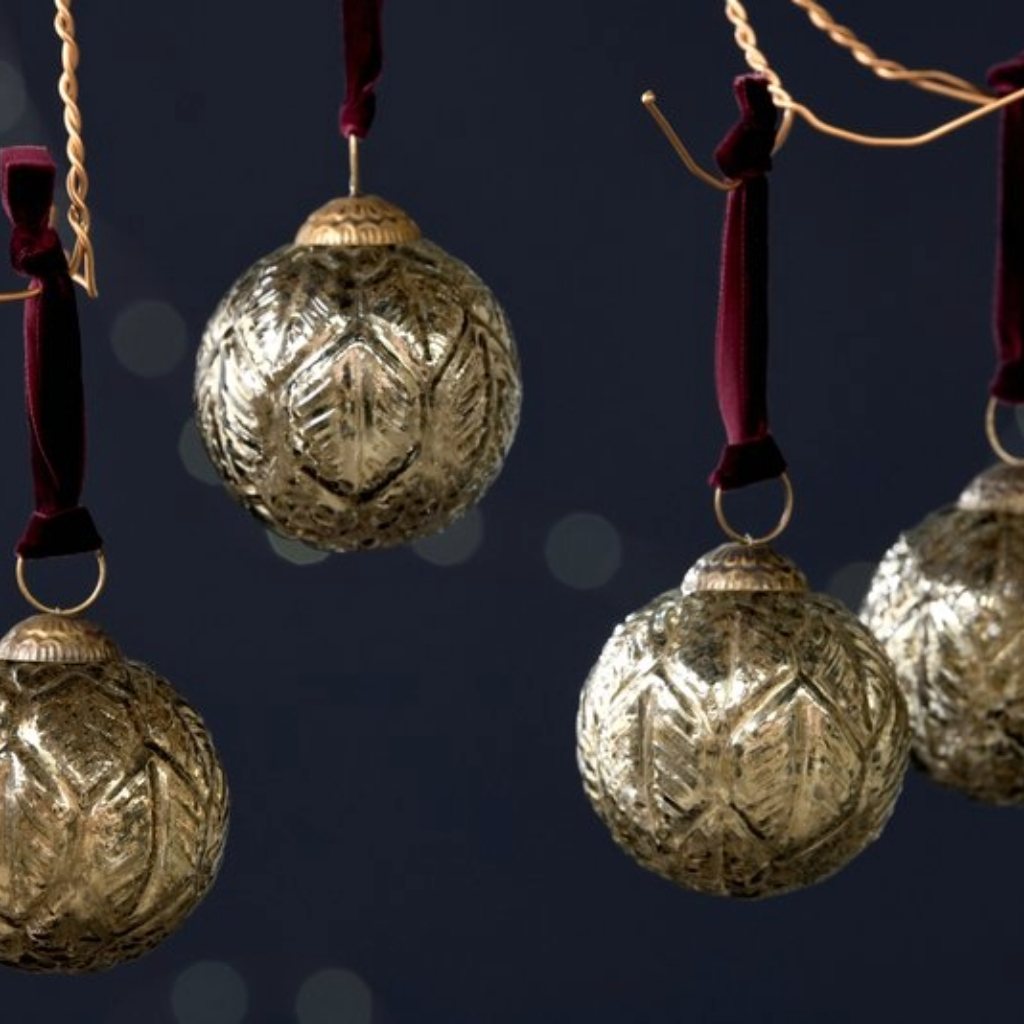 These recycled glass Patta Baubles have a timeless design and rich patina that brings bygone glamour to your festive setting. These beautifully patterned decorations are individually mouth blown into moulds and finished with an antique-style clasp and elegant velvet ribbon.