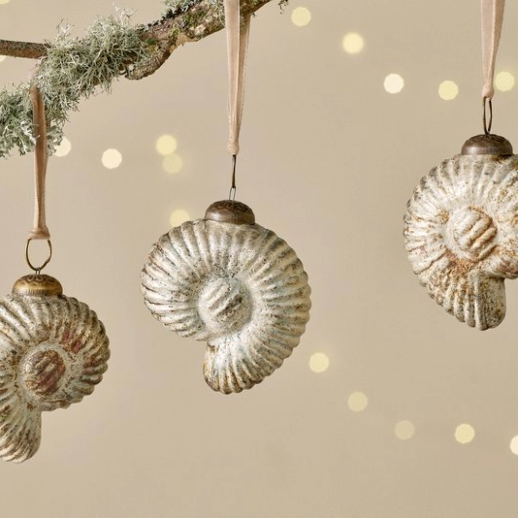 Made from recycled glass with a rustic gold finish that has a unique aged patina, they take inspiration from natural treasures found while beachcombing and the delight we find in the wonder of the world around us: something that is always worth remembering as we come together in celebration at this time of the year. Finished with an antique-style clasp and elegant velvet ribbon.