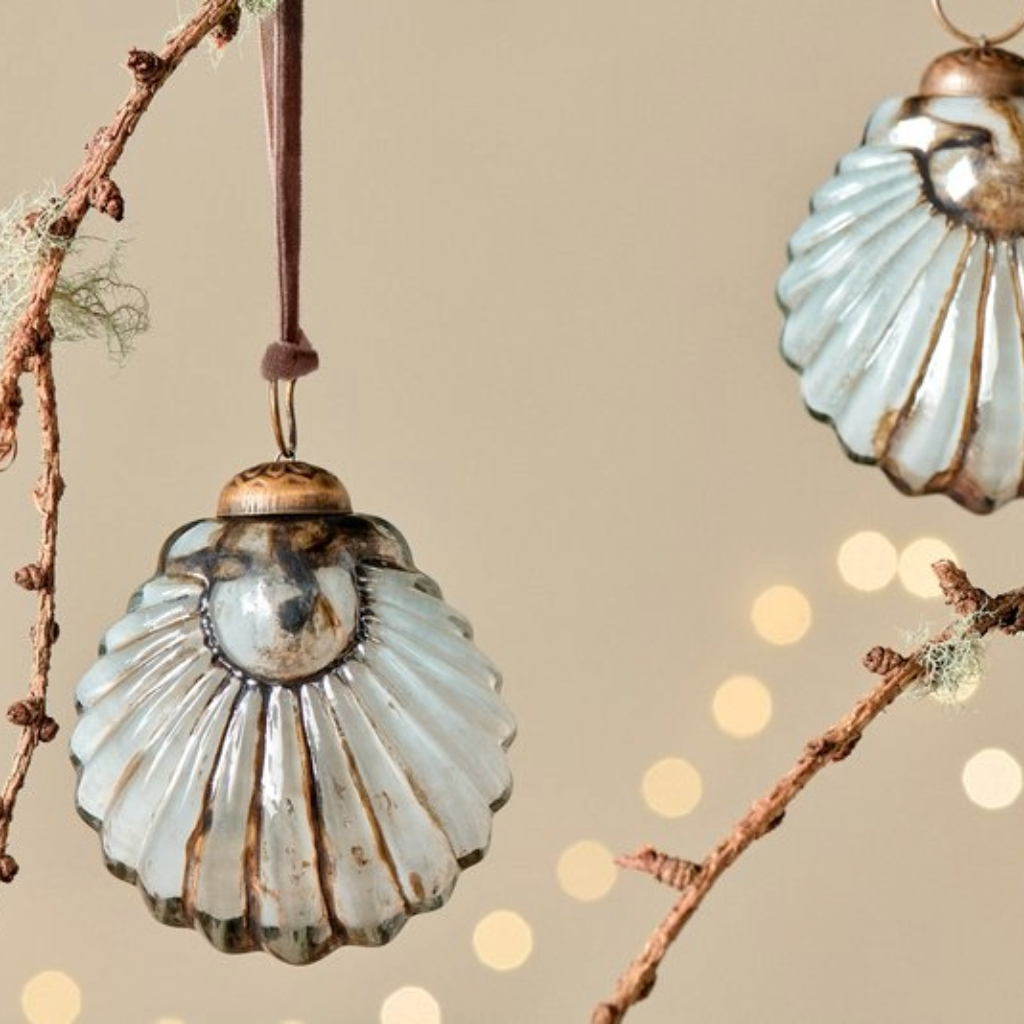 The pale smoked glass looks striking against festive foliage, and their delicate size and form would be perfect as a repeat piece hung liberally for a truly stunning effect. Finished with an antique-style clasp and elegant velvet ribbon.