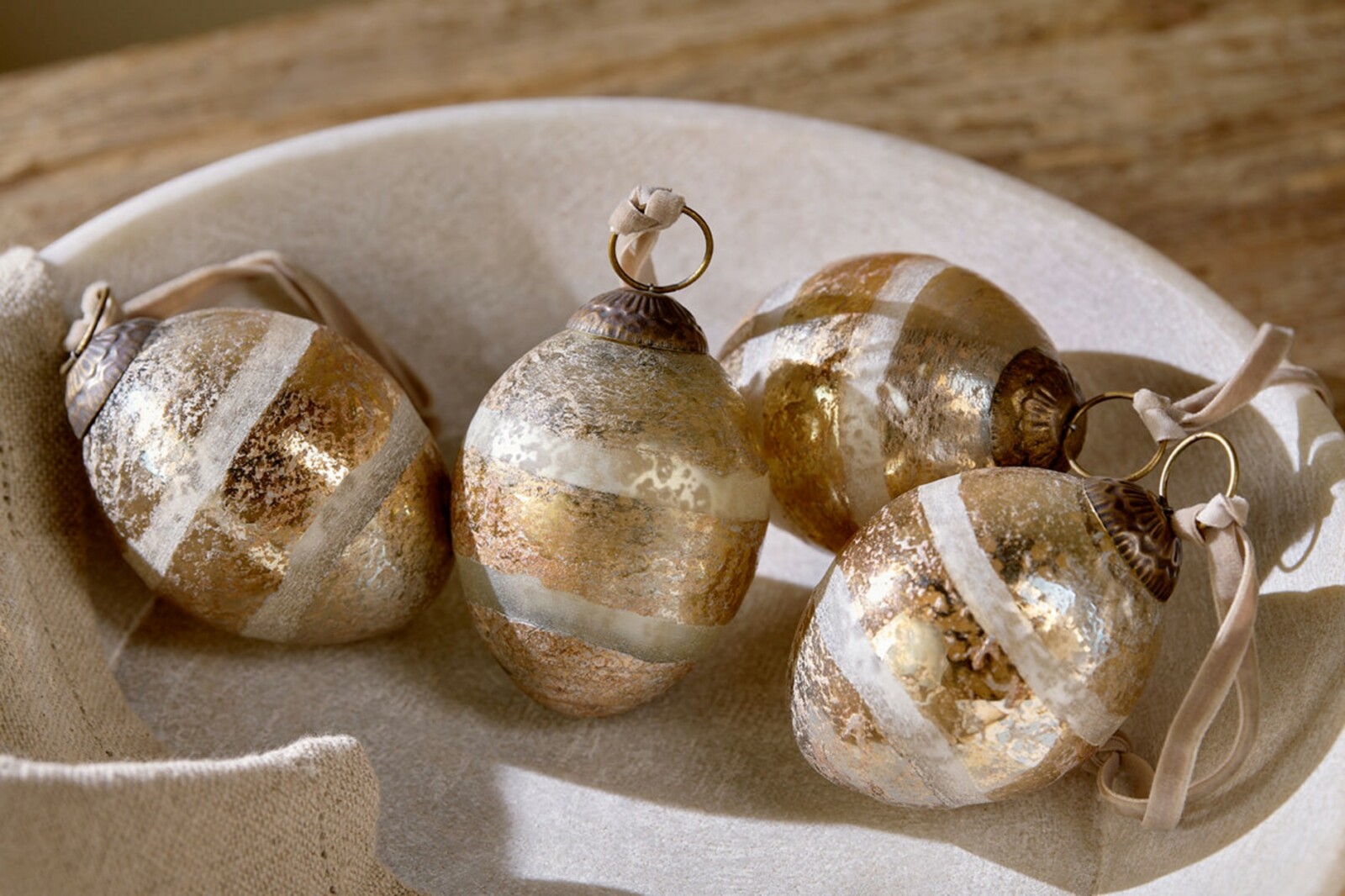 These elegantly shaped Viti Gold Baubles in pared-back tones of antique gold and silver have a wonderfully irregular striped patterning and are a beautiful addition to a naturally festive room decor. Organically shaped, they bring substantial structure to a tree scheme and create a beautiful look as part of a table setting or added to a seasonal garland. The understated antique bronze clasp finishes the sophisticated look.