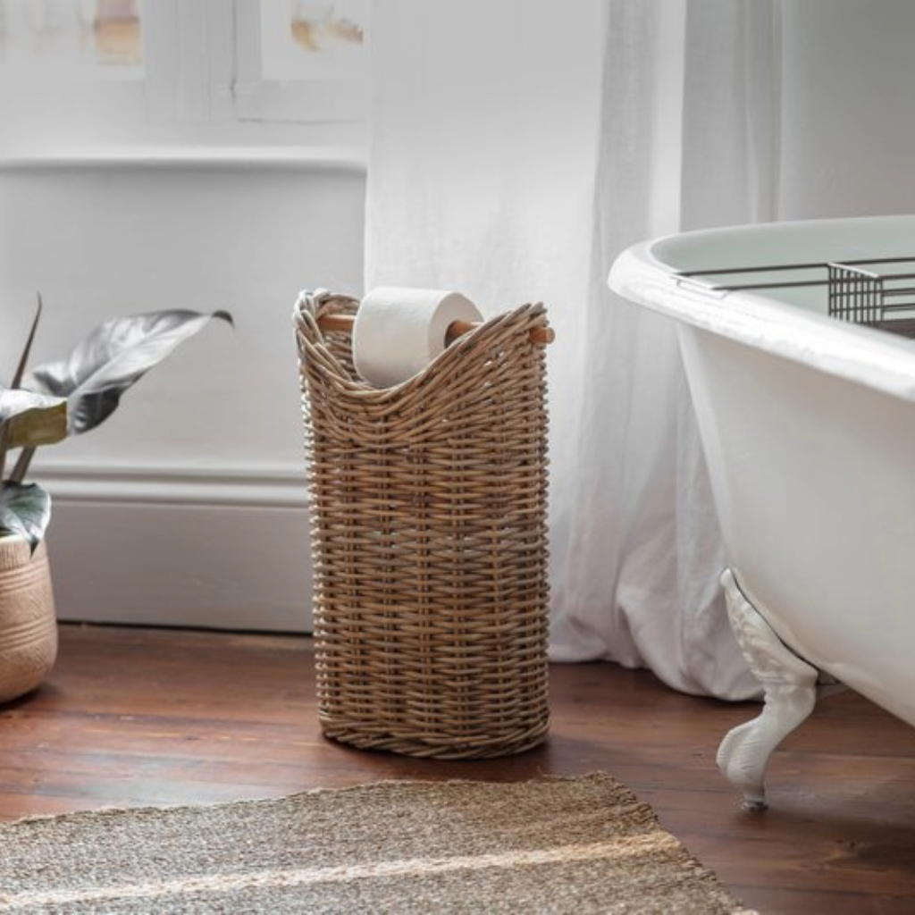 The Amandi rattan toilet roll holder, adds a natural and calming tone to a bathroom or lavatory. The warm tones of the natural rattan have been expertly woven using a traditional Indonesian basket technique. The bamboo rod, removes easily to hold a loo roll and the deep basket is designed to store up to 8 rolls.