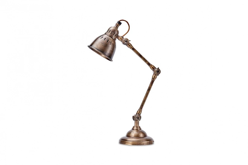 This perfectly proportioned Tubu desk lamp has an antique brass finish and adjustable head design. Its conical lamp head has a cut out design around its perimeter.