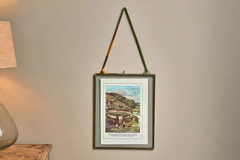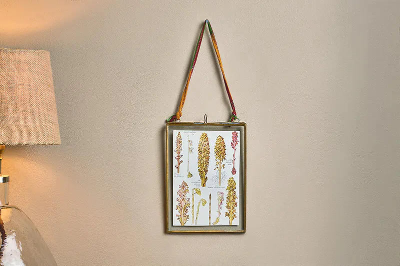 The glass front and back of these Kiko frames make them great for photographs, or other precious keepsakes like postcards, concert tickets and drawings. They look great grouped together in a range of sizes and orientations. Each one is strung with a recycled sari tie.