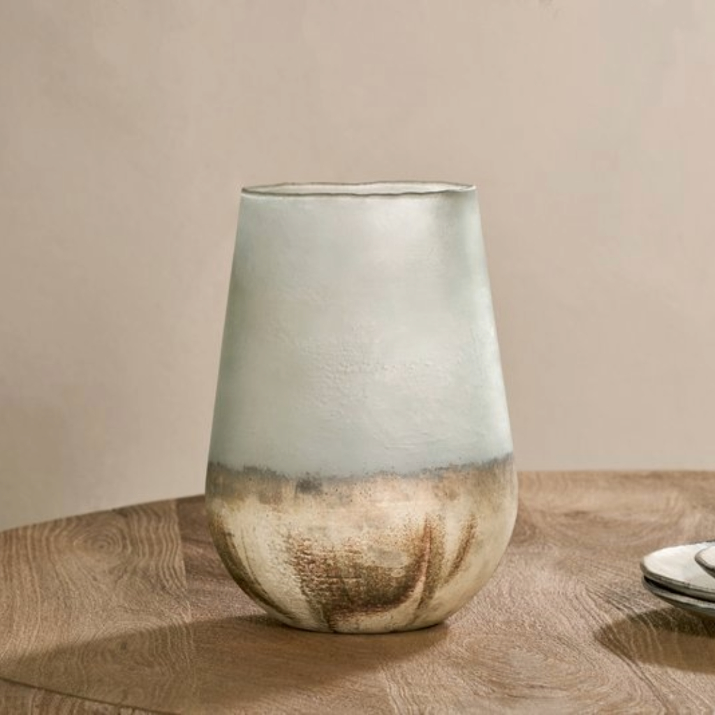 The Ngolo vase is a beautiful piece that adds interest to a sideboard or table setting with its subtly smoked glass and antique finish at the base. It is a decorative object in its own right. The delicate organic shape looks beautiful with fresh blooms.