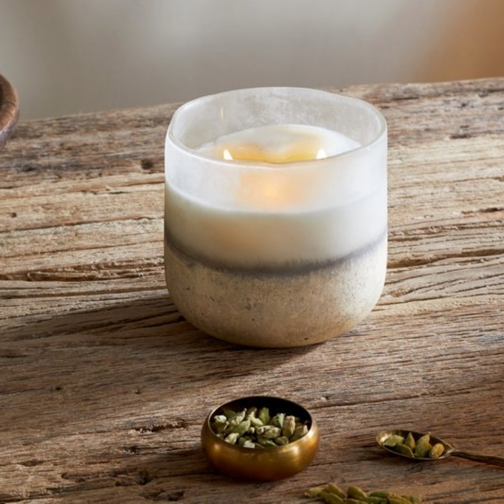 This scented candle is made in the UK by a family-run business, using a bespoke fragrance crafted exclusively for this collection. An evocative scent with rich notes of sandalwood, earthy cedarwood, and warming amber, it captures the essence of distant travels and the spirit of discovery. The vessel is finished with a beautifully textured design and is intended to be reused once the candle has burned through.