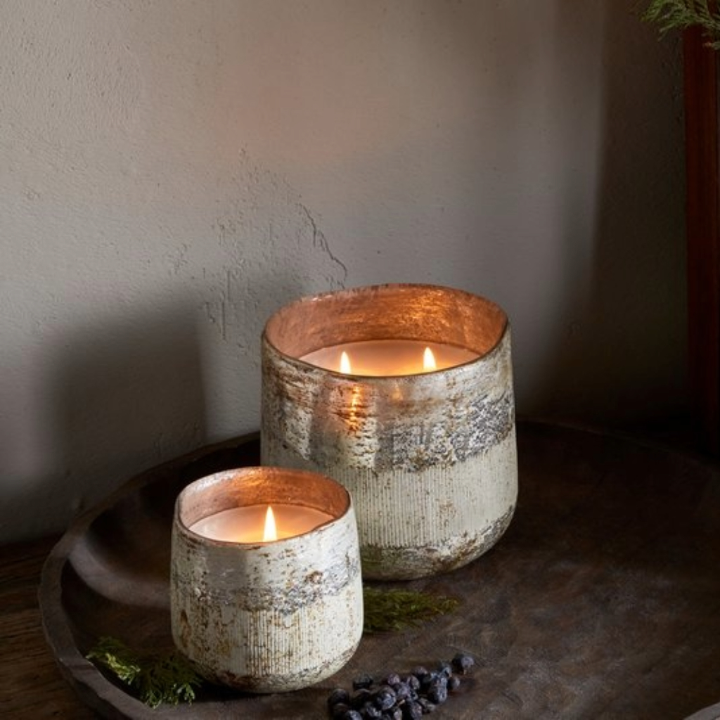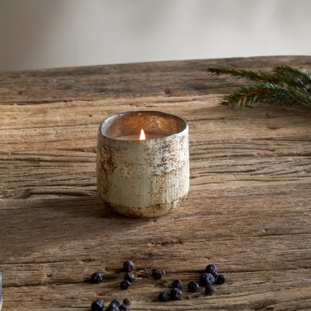This scented candle is made in the UK by a family-run business, using a bespoke fragrance crafted exclusively for this collection. Woody notes of eucalyptus and fir, spiced juniper and black pepper are expertly blended to evoke the scent of winter. The vessel is finished with a beautifully textured design and is intended to be reused once the candle has burned through.