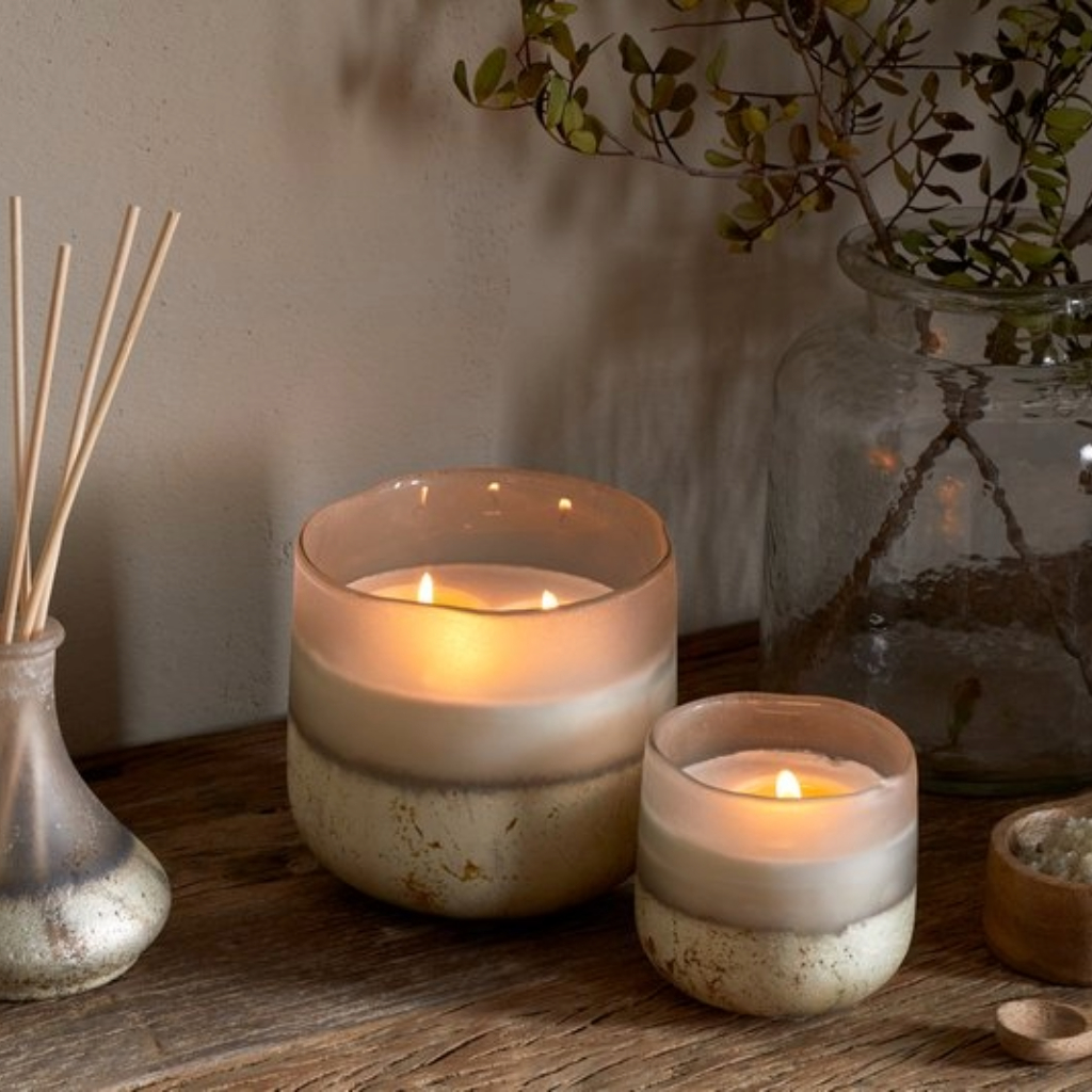 This scented candle is made in the UK by a family-run business, using a bespoke fragrance crafted exclusively for this collection. Fresh, crisp notes of sea salt, warming sandalwood, and earthy moss create a soothing aroma that evokes the comfort of home. The vessel is finished with a beautifully textured design and is intended to be reused once the candle has burned through.