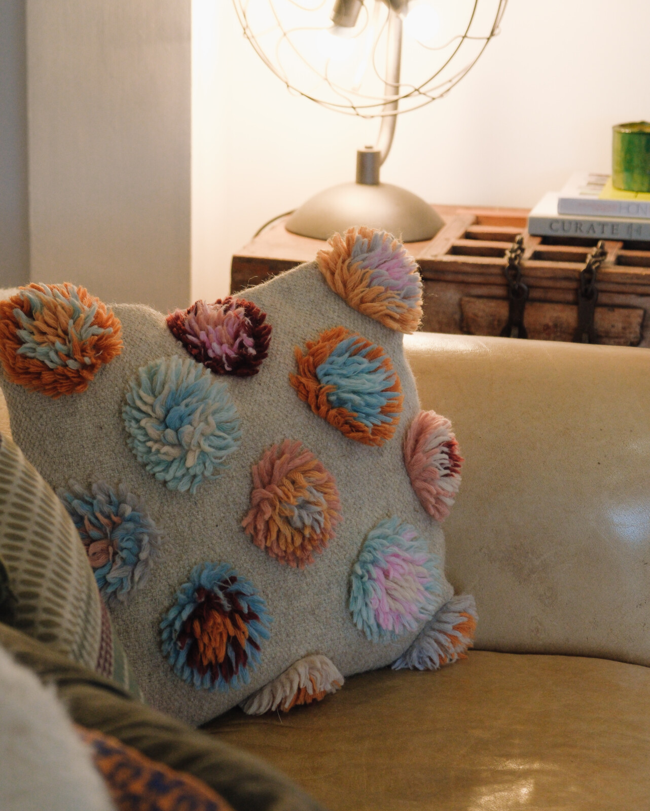 Let the Hapus cushion bloom in your home with its tufted wool flowers in beautiful colours. The woven base provides a beautiful textured contrast to the soft wool flowers, while the backside of off-white cotton canvas adds a calm visual counterpoint to the front. This cushion adds a charming and warm expression to any room.