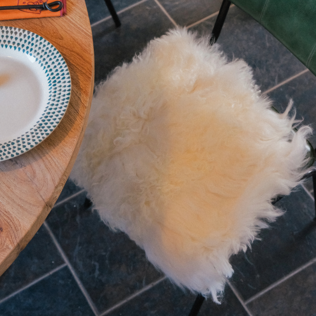 A soft lambs wool square seat pad.