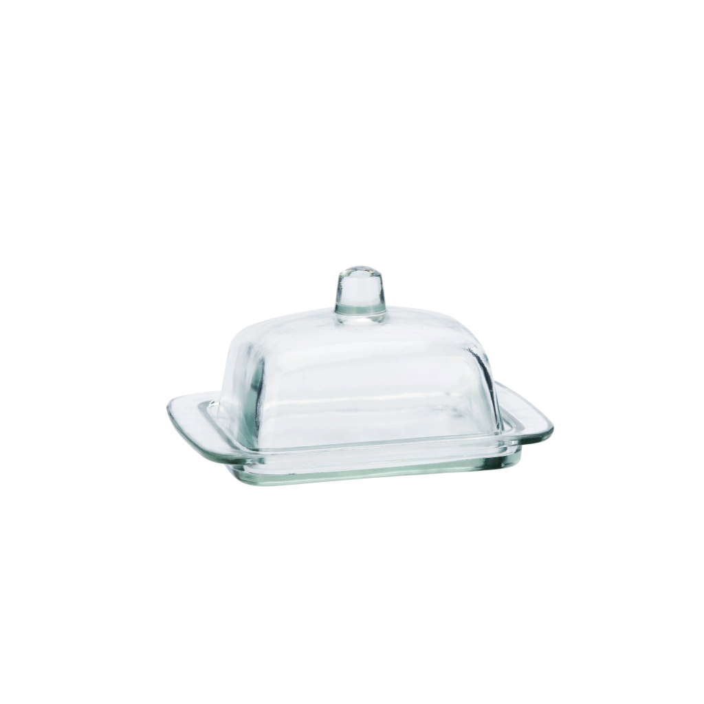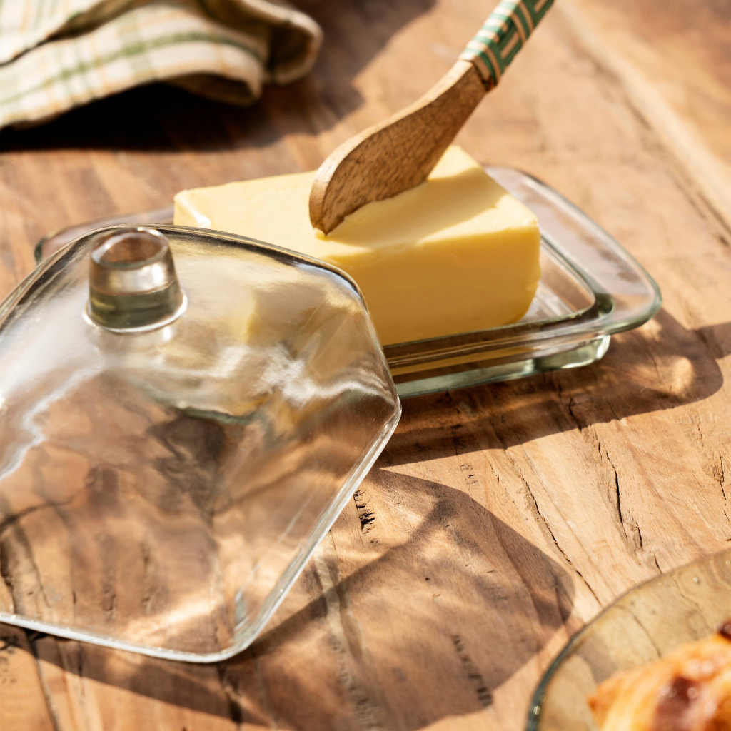 A clear glass butter dish with a minimalist design that keeps butter fresh and visible. Durable and practical, it moves easily from fridge to table and fits seamlessly into both modern and traditional kitchens, making everyday routines simple and tidy.