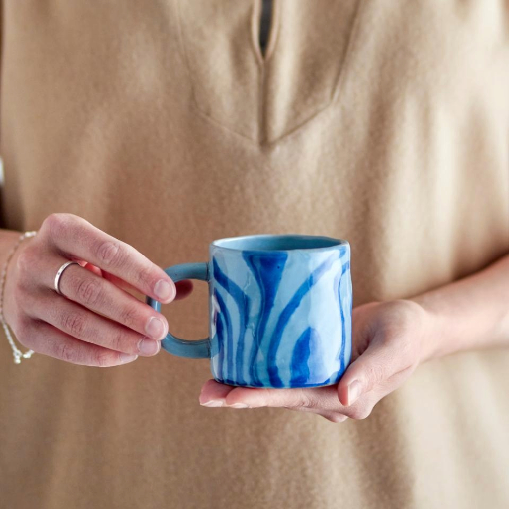 This blue stoneware mug has a classic shape and size, making it perfect for enjoying your favourite drink.