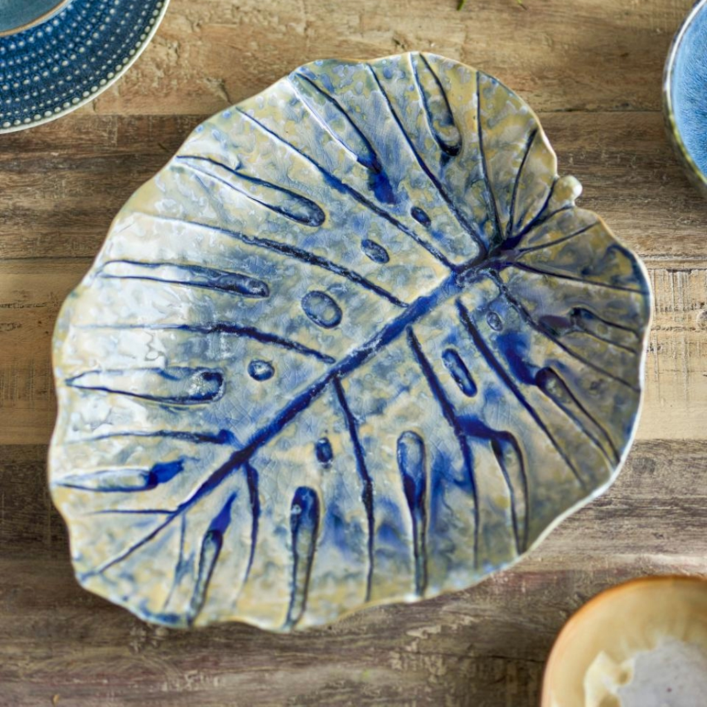 This leaf-shaped stoneware platter features a reactive glaze with natural tones and unique colour variations. Perfect for serving or as a decorative piece, it adds a relaxed, organic touch to any home. Dimensions L32.5 x H4.5 x W26.5 cm
