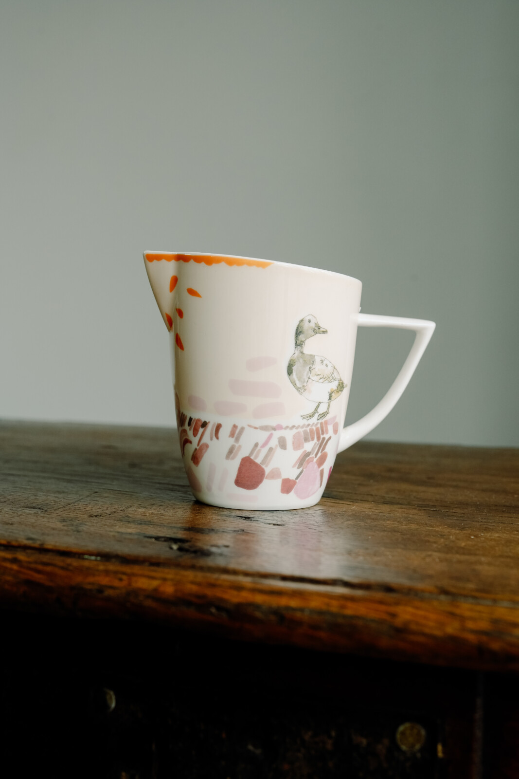 A pink and orange jug decorated with a duck. The jug is characterised by its slanted opening and is finished with hand-painted marks in platinum lustre.